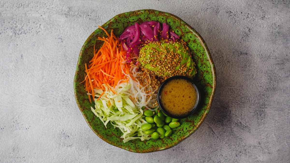 Poke bowl med glasnudler, edamame bønner, avocado, spidskål, syltede rødløg, ananas, kimchi sesam og asian dressing. Serveres med valgfri drikkevare.