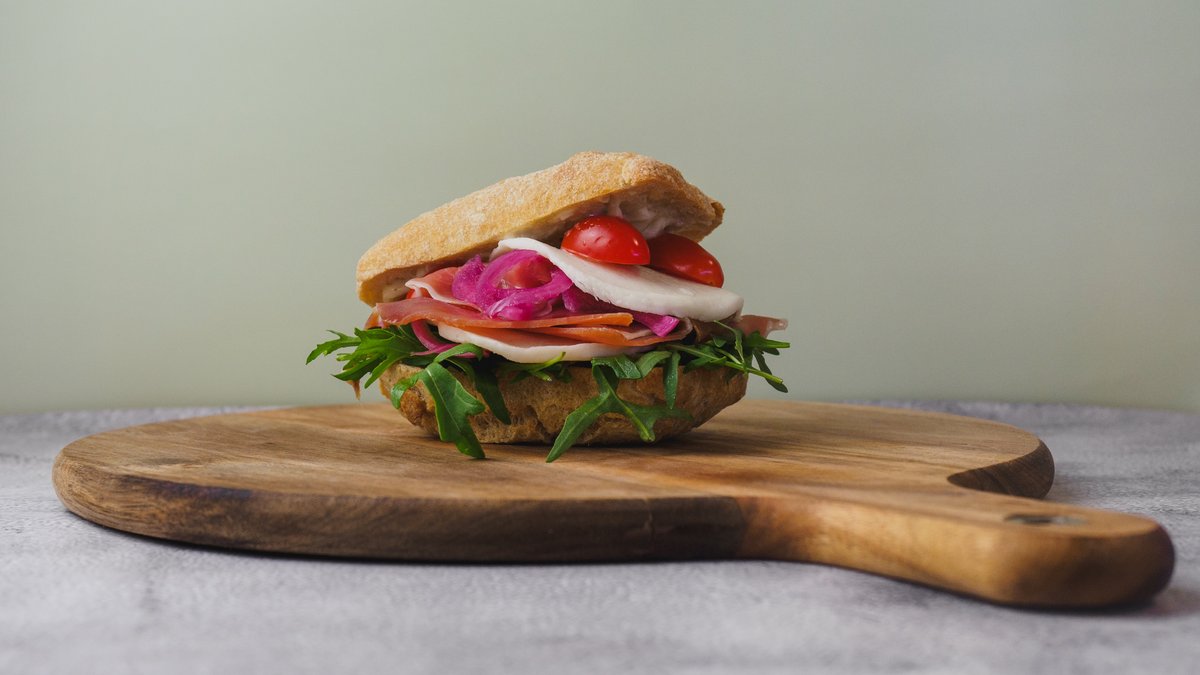 Surdejsbrød (ikke bolle) med fyld af lufttørret skinke, pestomayo, salat, gammel knas, cherrytomater, hjemmelavet dressing og syltet rødløg. Serveres med valgfri drikkevare.