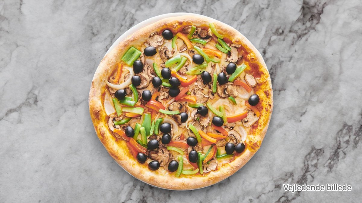 Tomatsauce, ost, pepperoni, oliven, peberfrugt og oregano.
