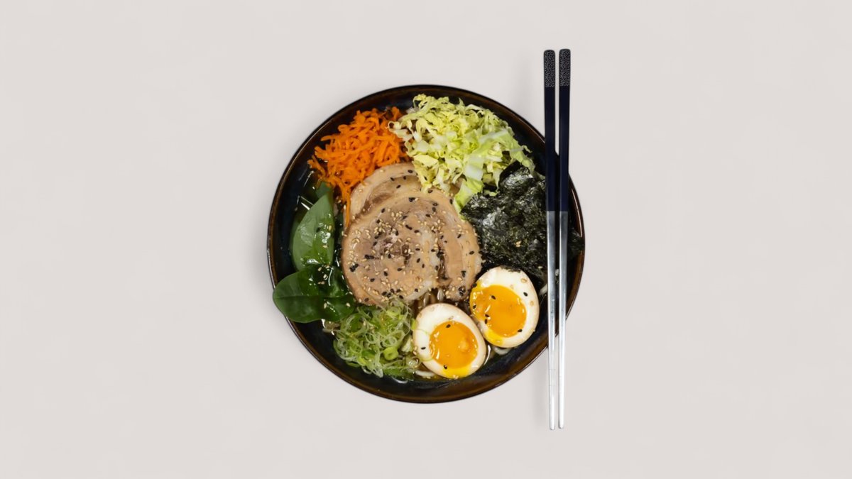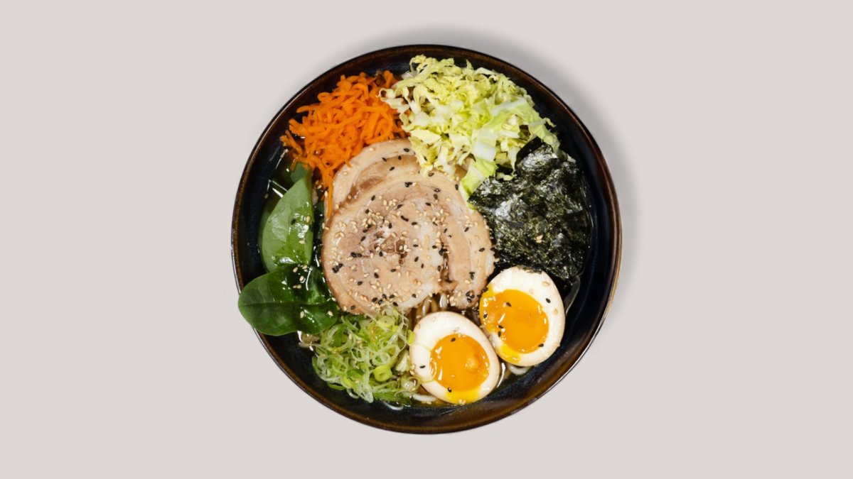 Svinesuppe med ramen nudler, misosauce, marineret kogt æg, nori flager, kinakål, spinat og gulerødder, forårsløg.