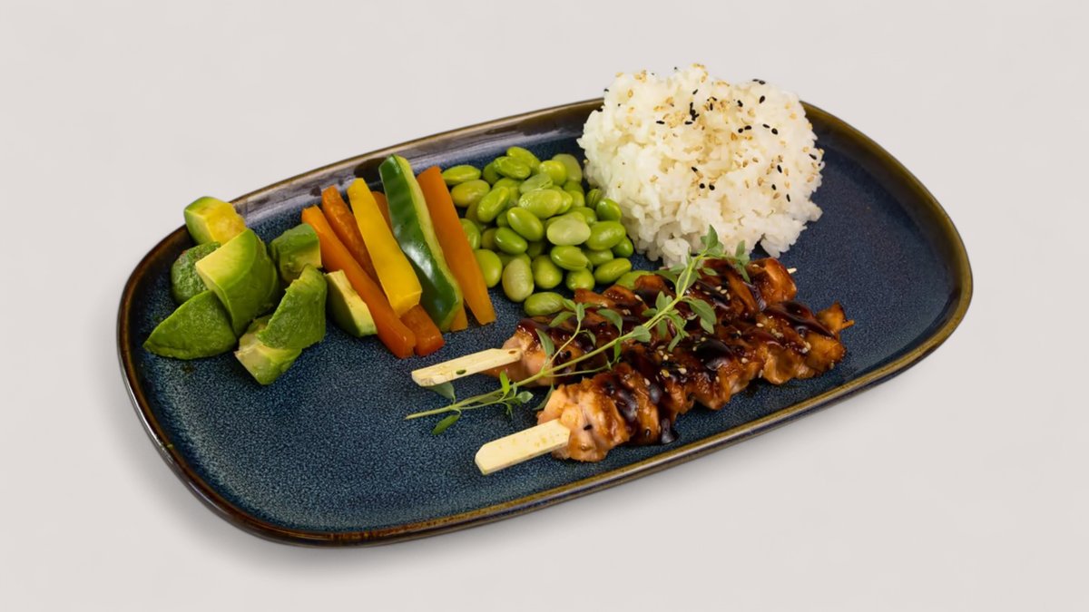 Sprød kylling teriyaki stick, serveres med ris, avocado, peberfrugt og edamame.