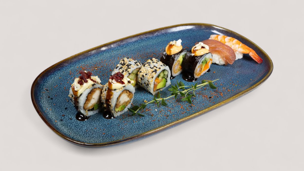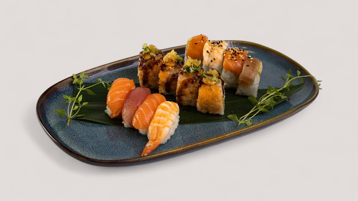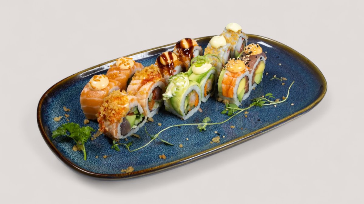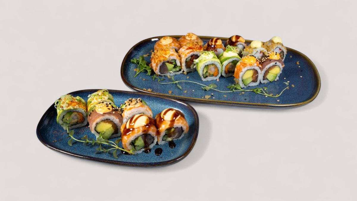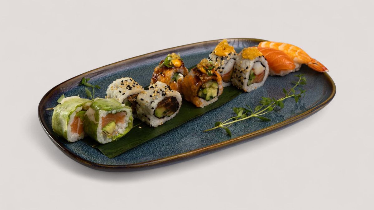 Nigiri: 2 x Laks 1 x Reje 1 x Tun Uramaki: 4 x Rainbow Dragon 4 x Fusion Crunch Tempura Roll.