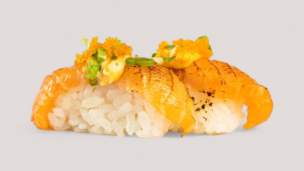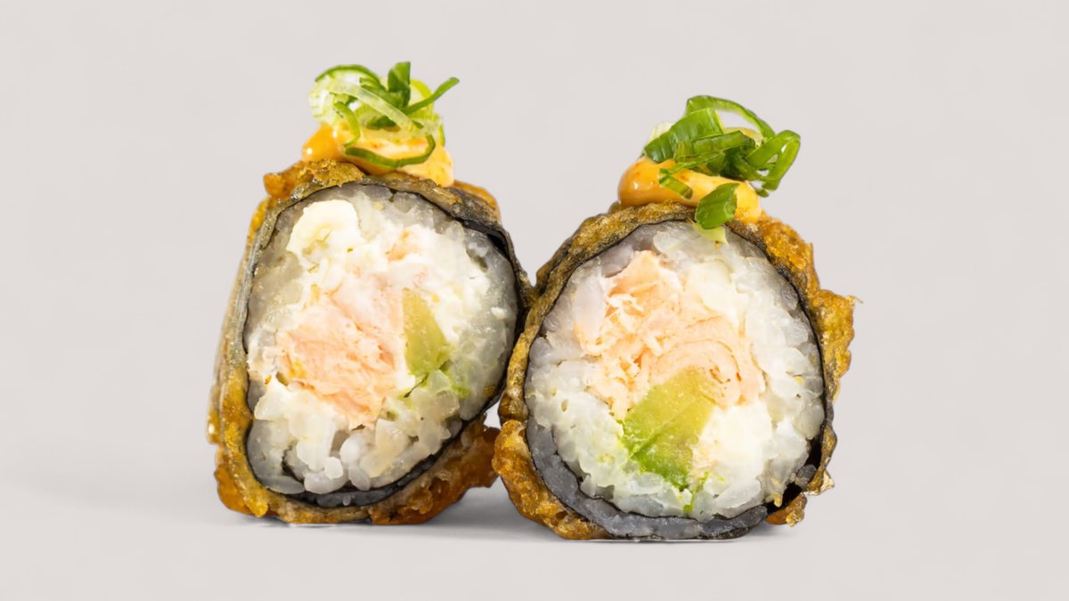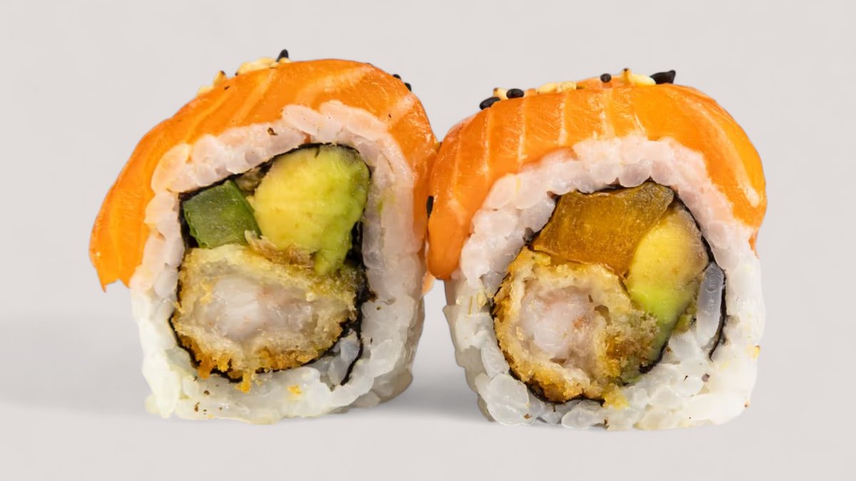 Dybstegt tempura rejer med avocado, flødeost og marinerede gulerødder, toppet med flamberet laks, chilimayo og forårsløg.