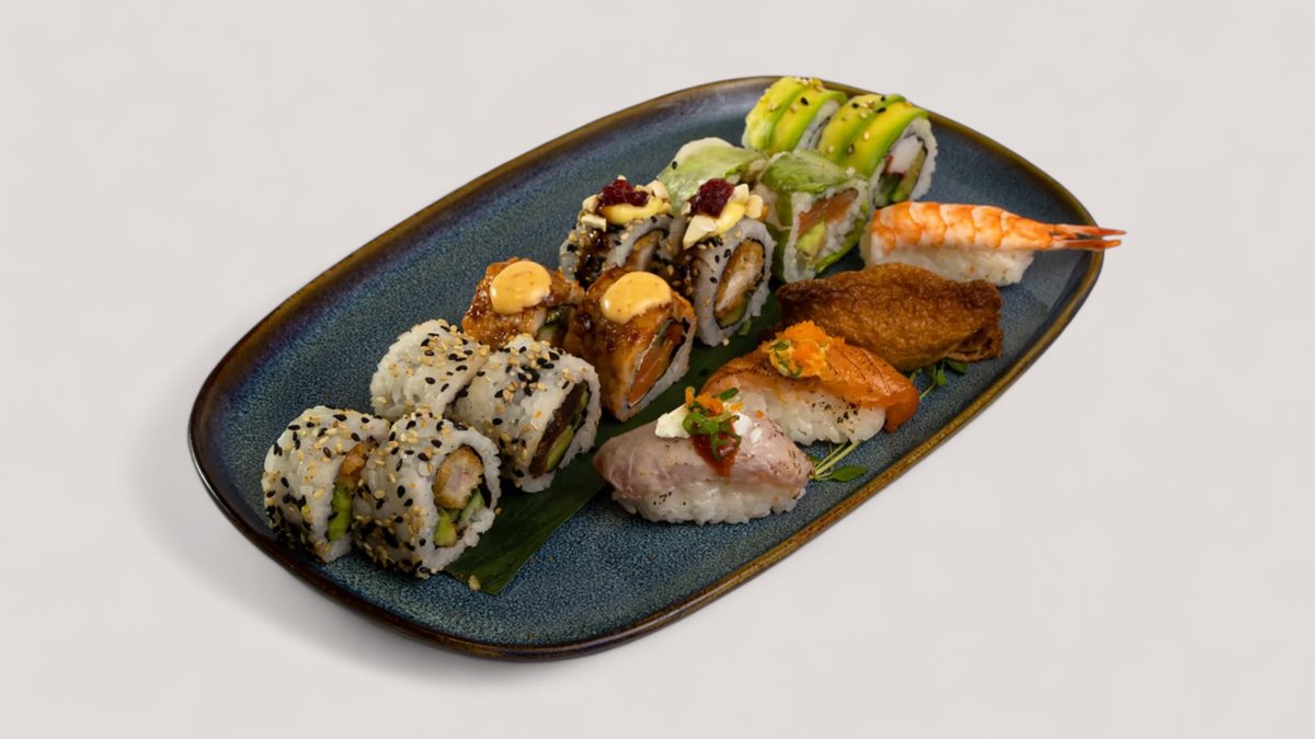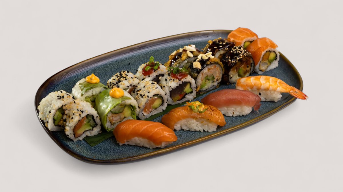 Nigiri: 2 x Flamberet Laks 2 x Flamberet Tun 2 x Reje Hosomaki: 8 x Laks 8 x Avocado Uramaki: 8 x Philadelphia Roll 8 x Rainbow Classic Roll Rice Paper Maki: 6 x Tempura.