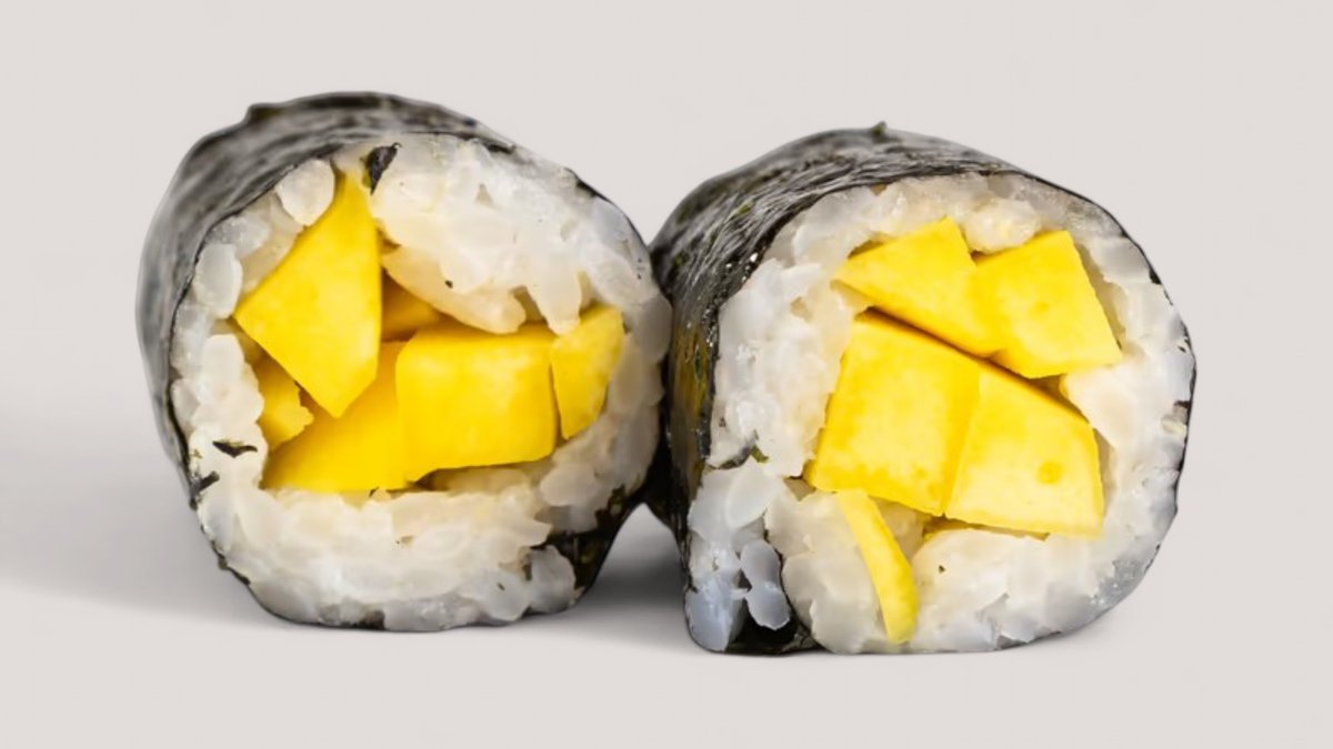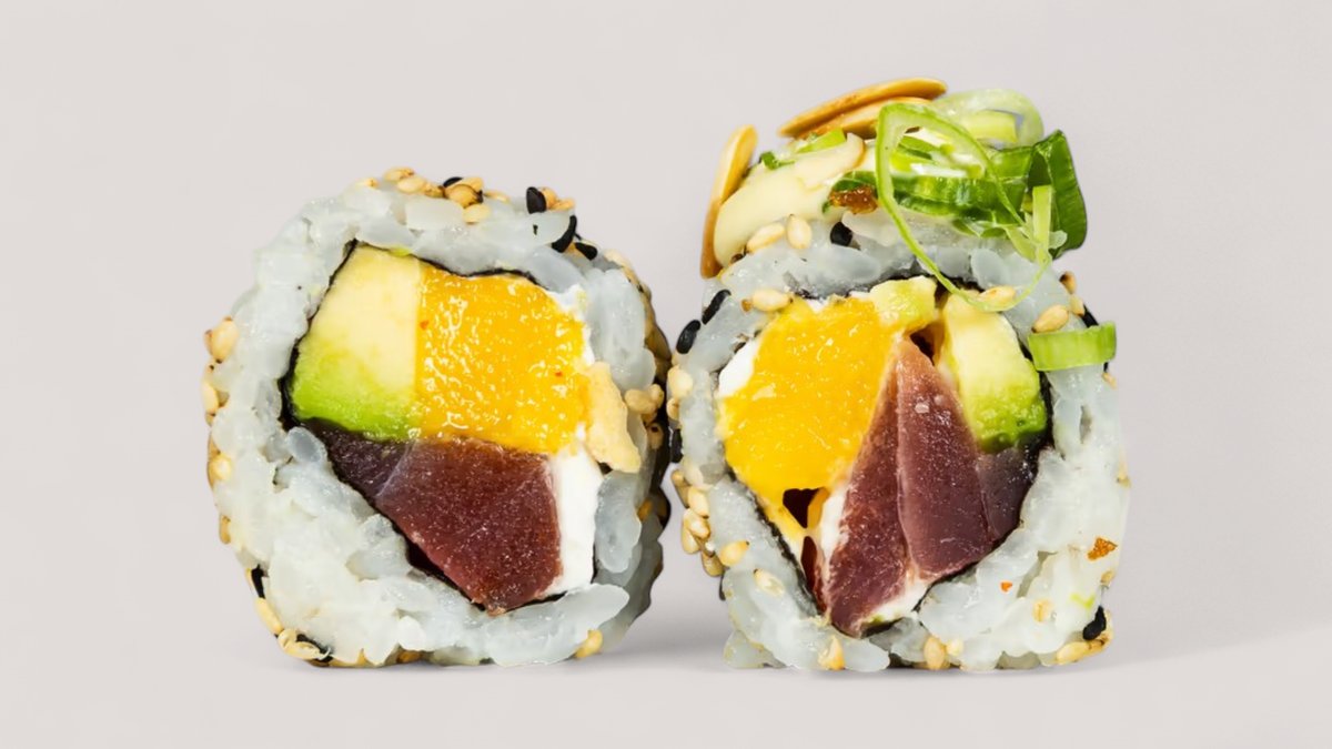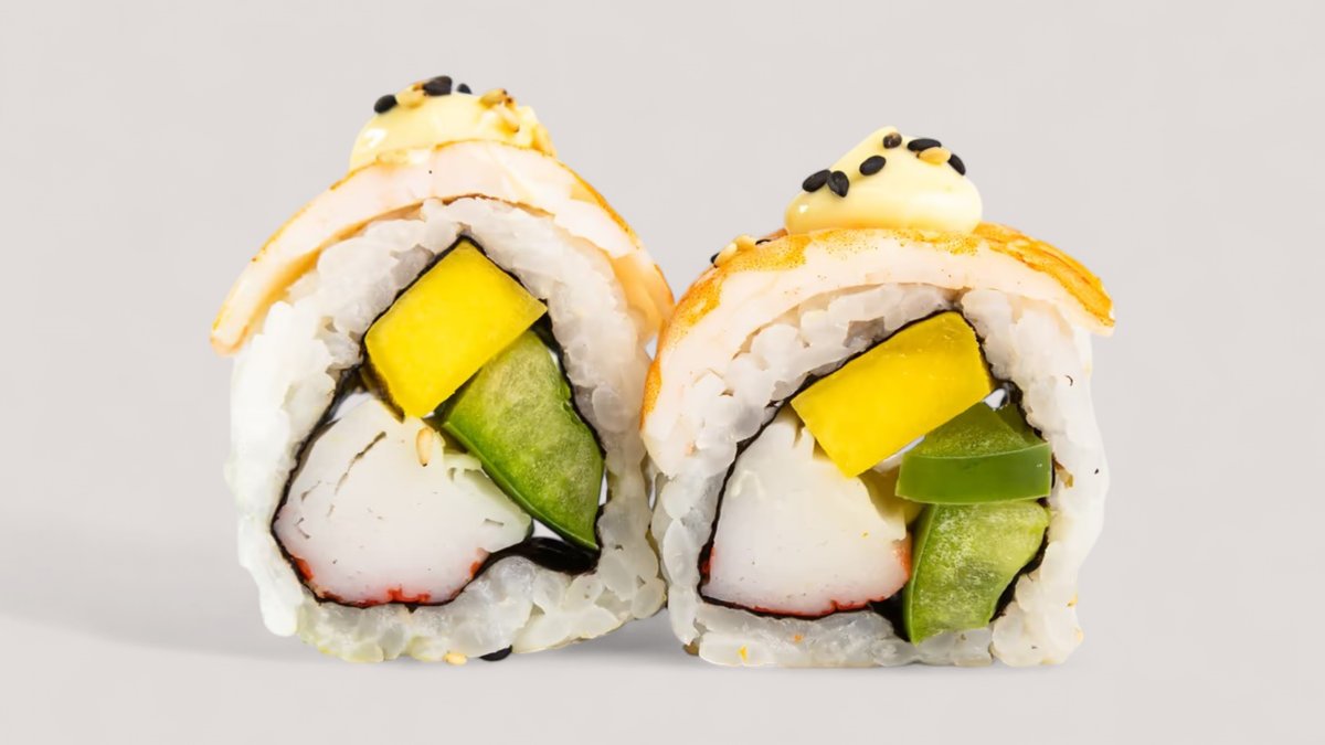 tofu, agurk peberfrugt og avocado, toppet med mango, teriyakisauce og forårsløg.