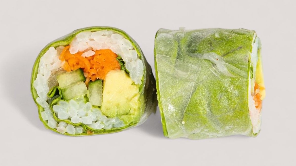 Rispapir med avocado, agurk, syltede gulerødder, salat, mynte og koriander, omviklet med ris og rispapir.