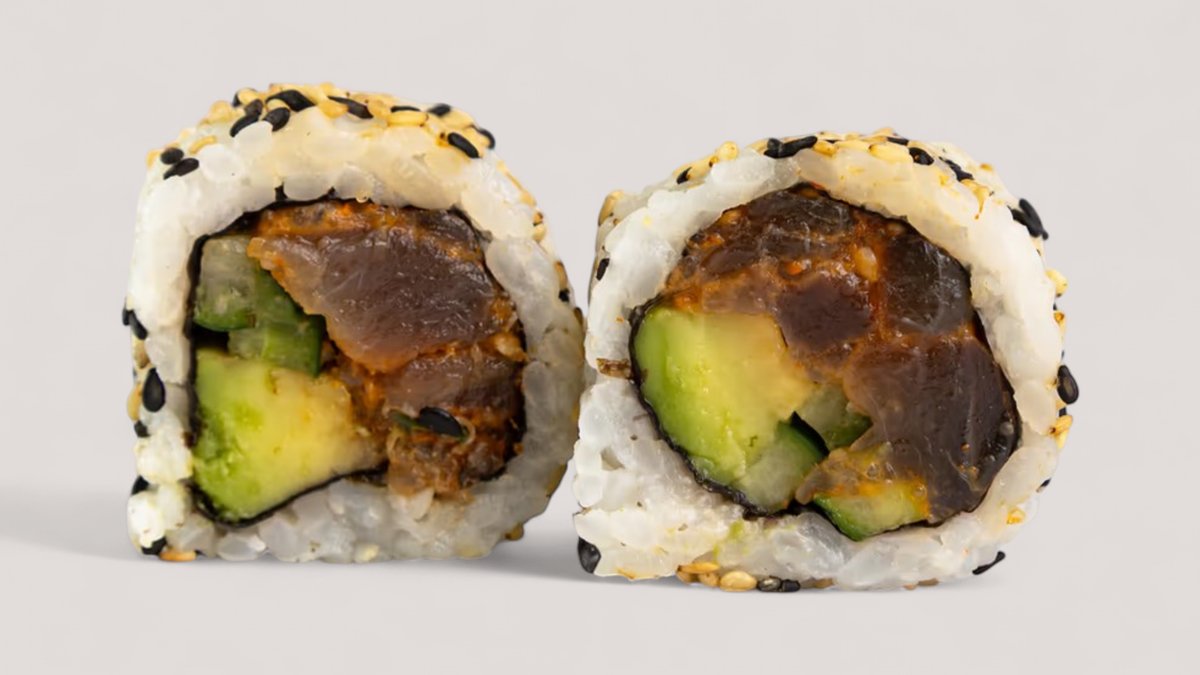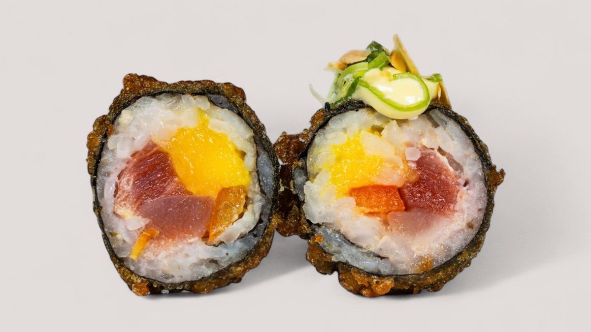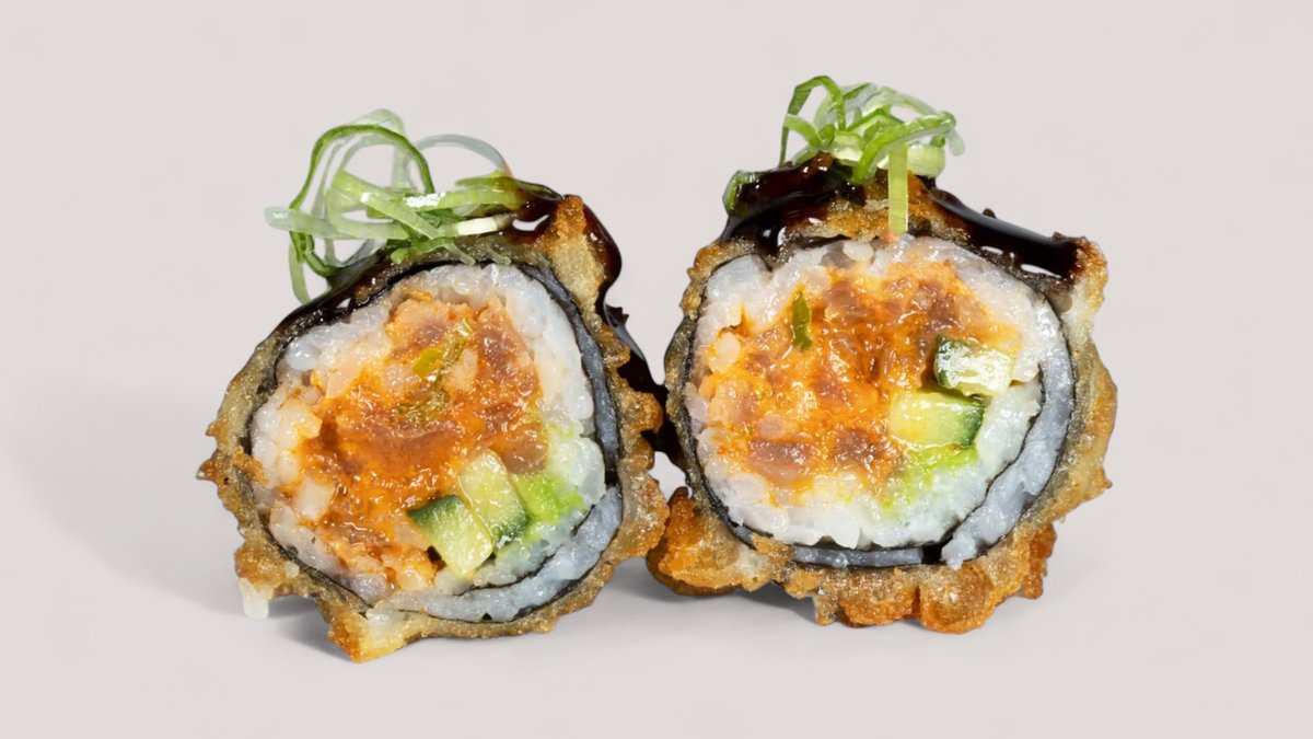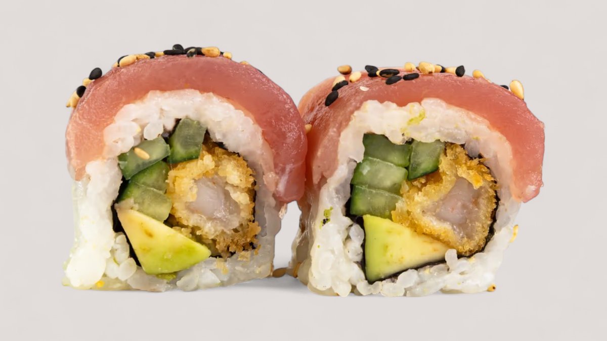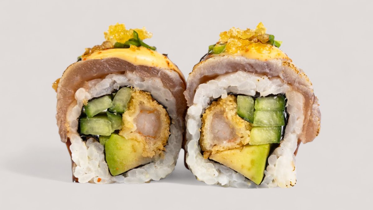 Tempura rejer med avocado og agurk, toppet med flamberet tun, Kimchi Fusion sauce, teriyakisauce, 7 krydderier, forårsløg og tempura crunch.