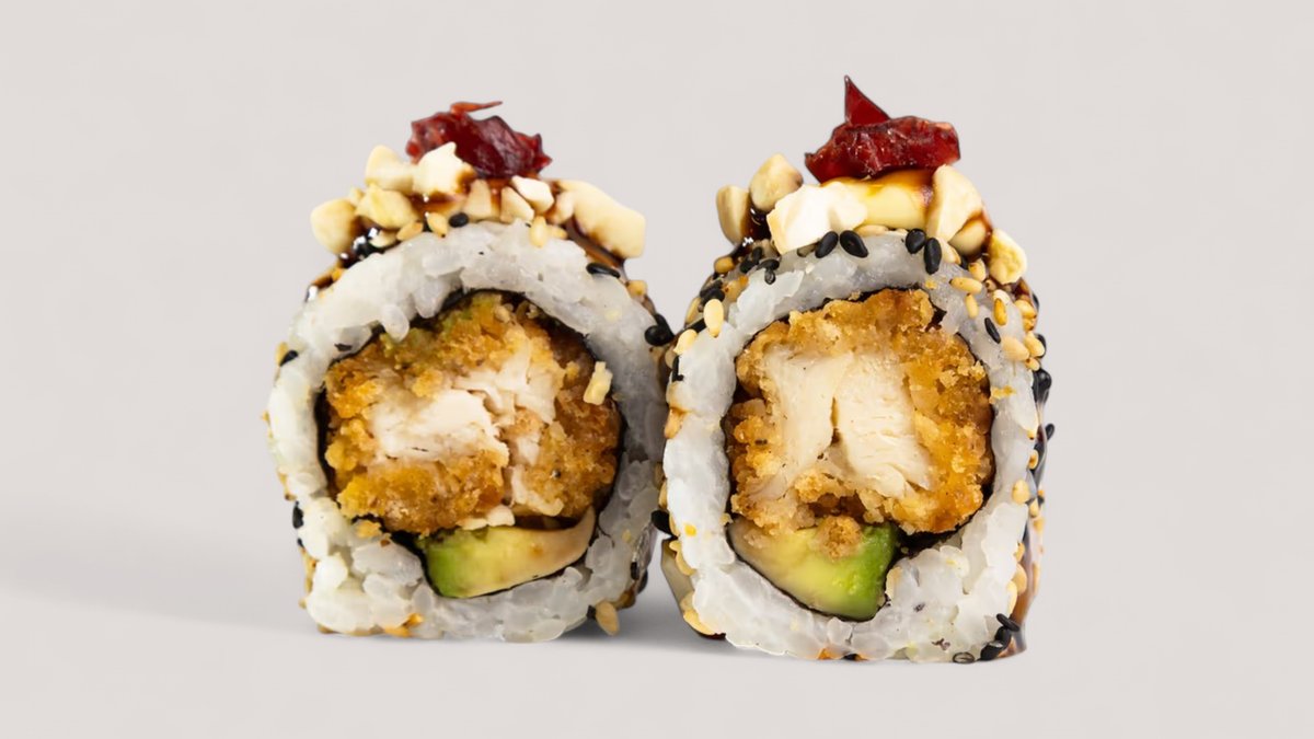 Sprød kylling med avocado og japansk mayonnaise, toppet med teriyakisauce, sesamfrø, knuste nødder og tranebær.