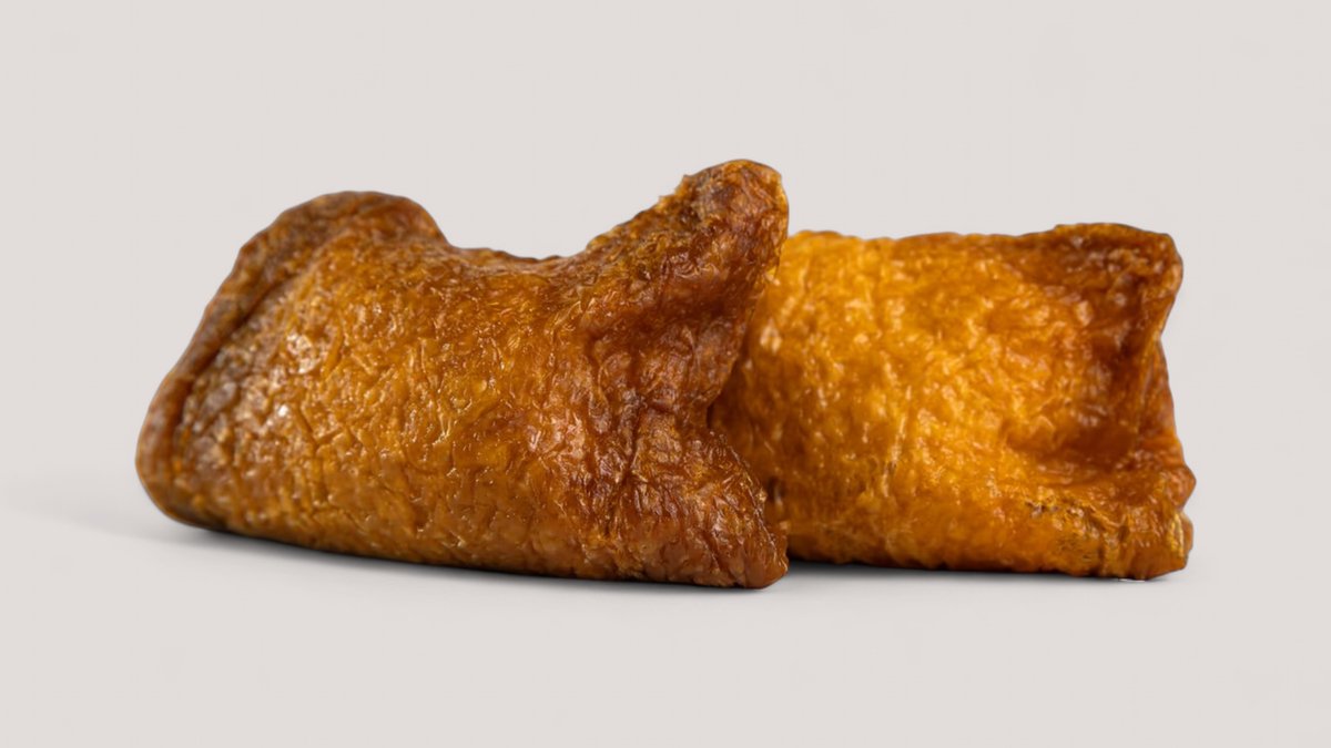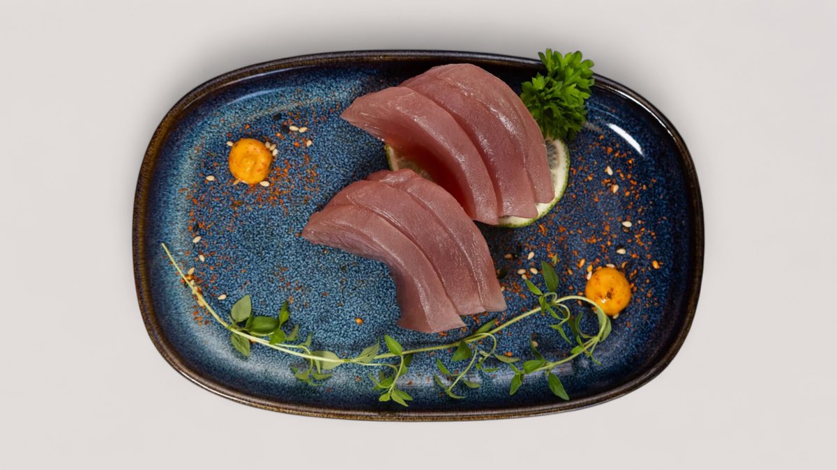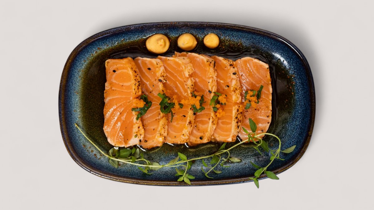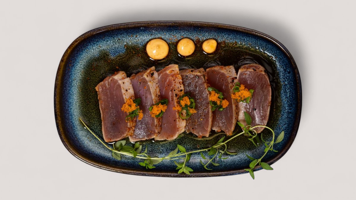 Serveres med ponzu sauce, forårsløg, masago, sesamfrø, togarashi.