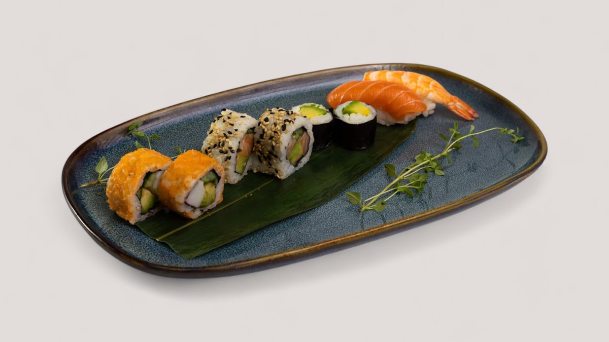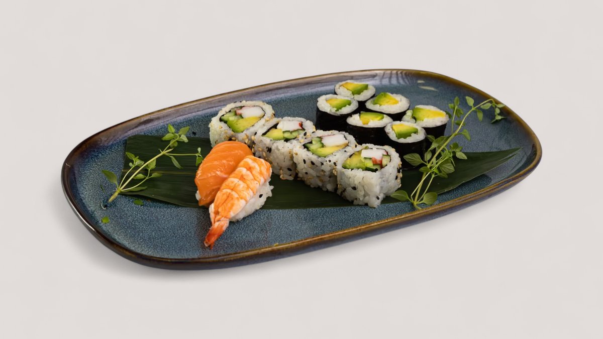 Nigiri: 1 x Laks 1 x Reje Hosomaki: 8 x Avocado Uramaki: 4 x California Crabstick Classic.
