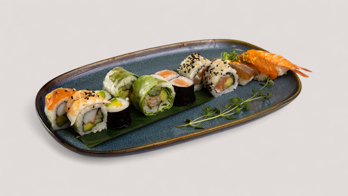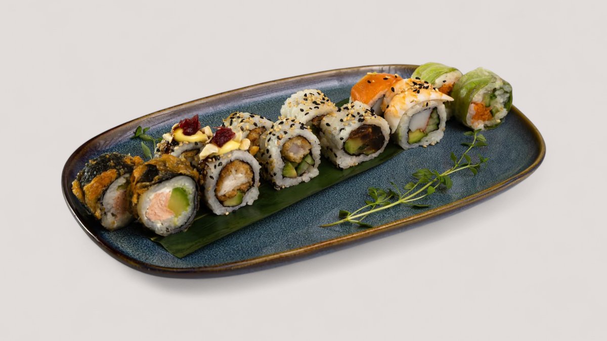 Hosomaki: 8 x Fried Laks Uramaki: 8 x Crispy Chicken Nuts 8 x Tempura Shrimp Classic Roll 8 x Spicy Tuna 8 x Rainbow Classic Rice Paper Maki: 6 x Veggie.