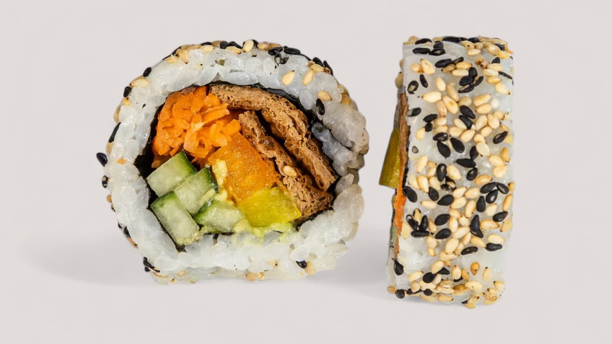 med peberfrugt, avocado og syltede gulerødder, toppet med teriyakisauce og sesamfrø.