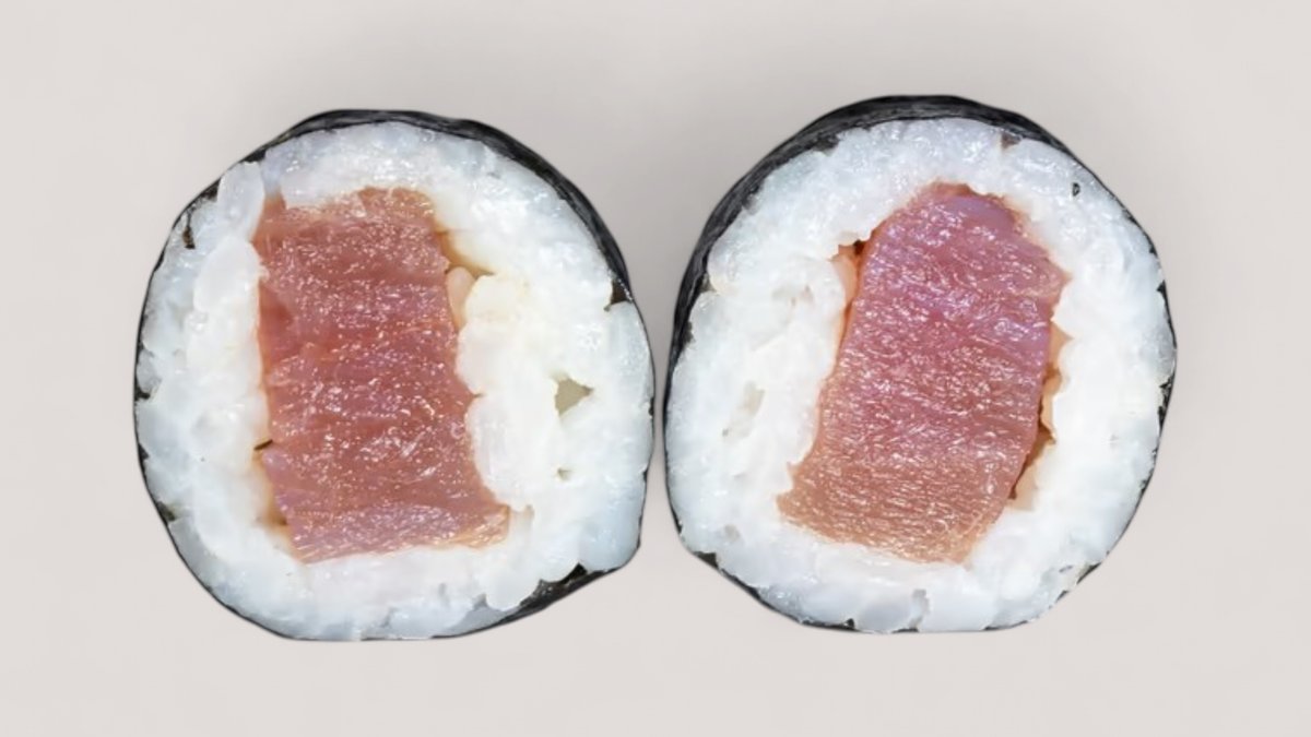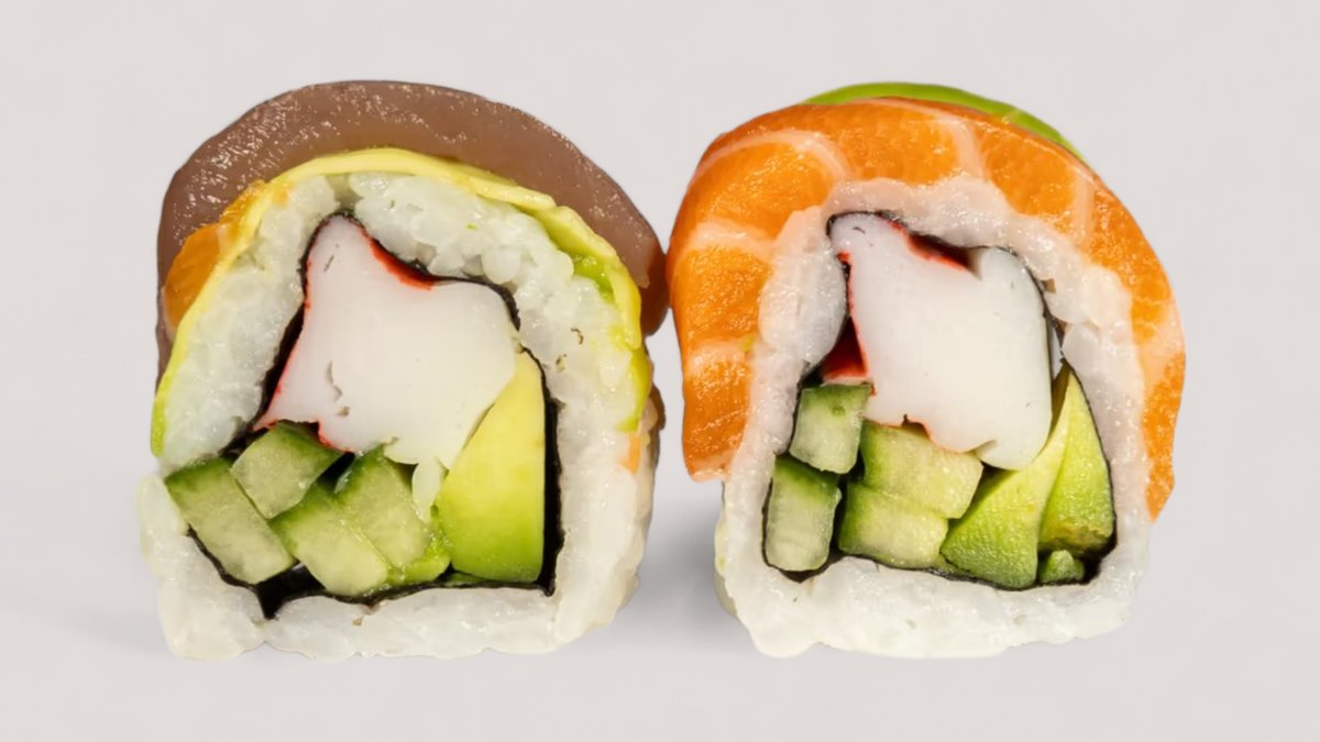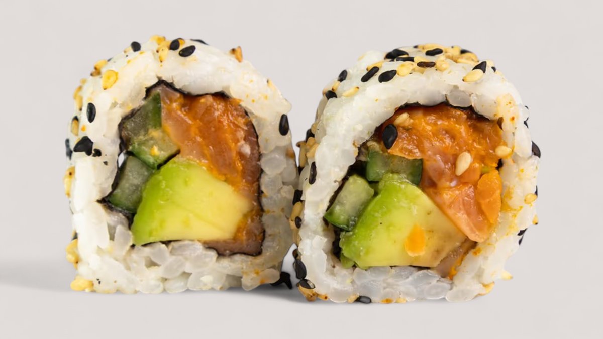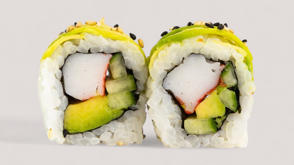 Surimi med avocado og agurk, toppet med tun og sesamfrø.