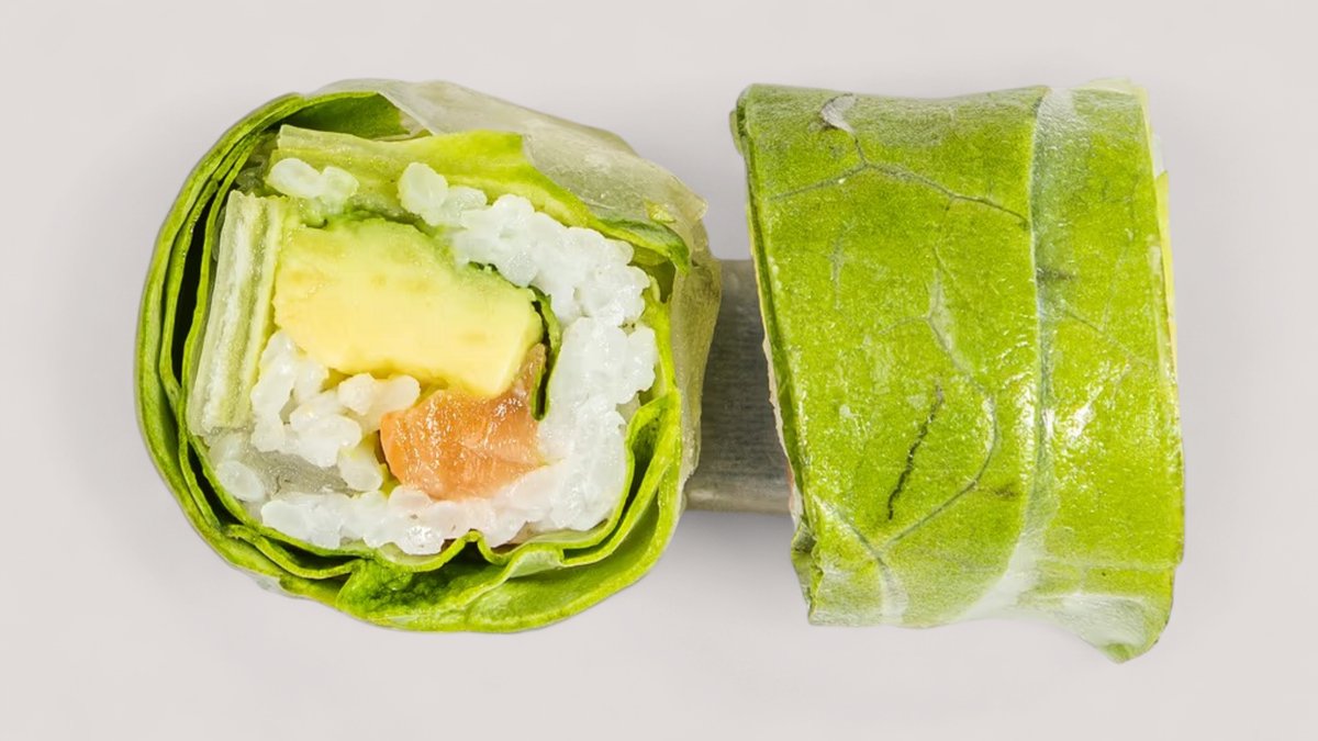 Rispapir med laks, avocado, salat, mynte og koriander, omviklet med ris og rispapir.