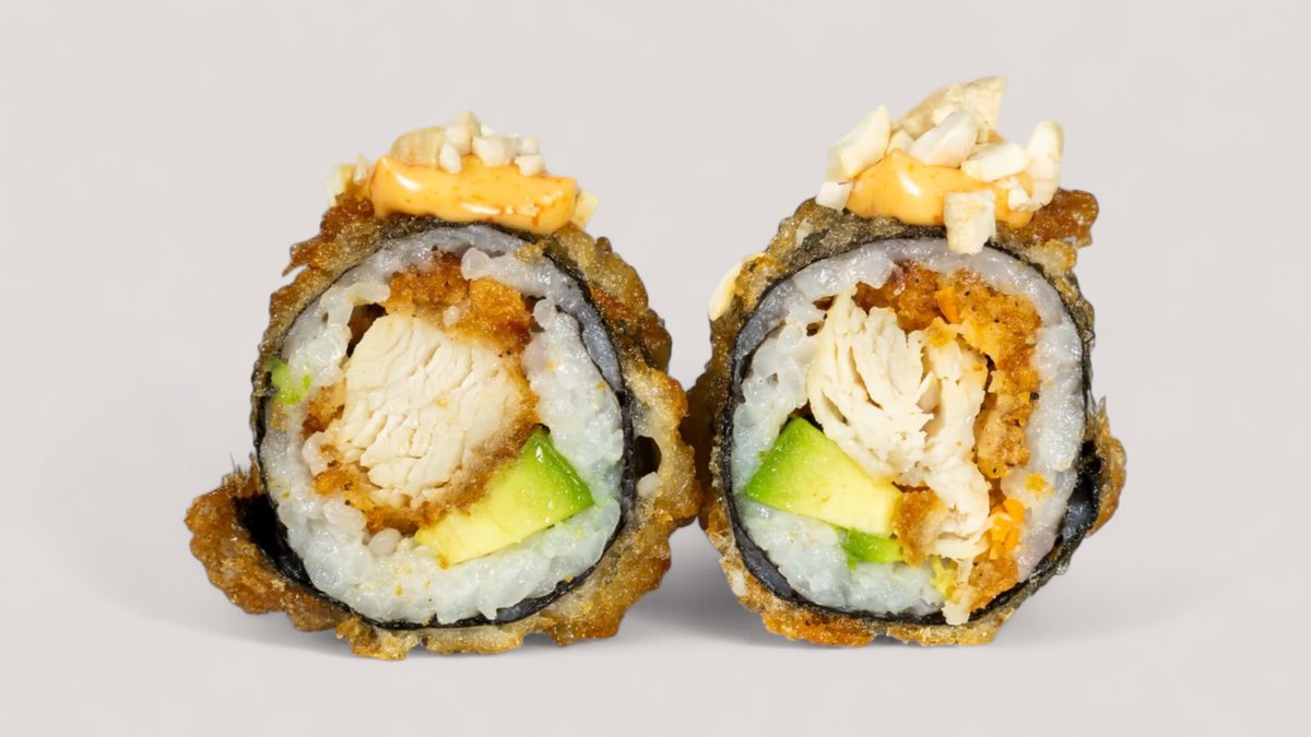 Dybstegt tempura rejer, avocado og agurk, toppet med teriyakisauce, chilimayo og knuste cashewnødder.