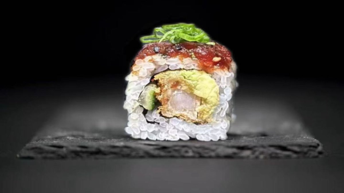 Indbagt reje, agurk og avocado. Toppet med japansk ravfisk og chilimayo.