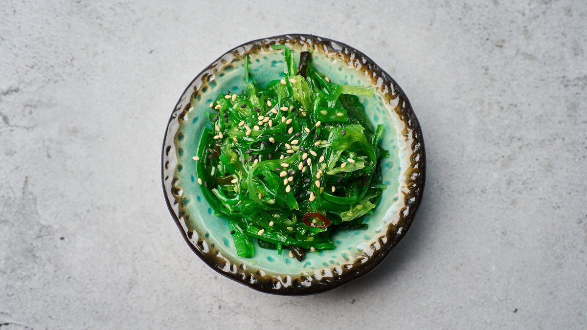Rå laks i skiver serveres på tang.