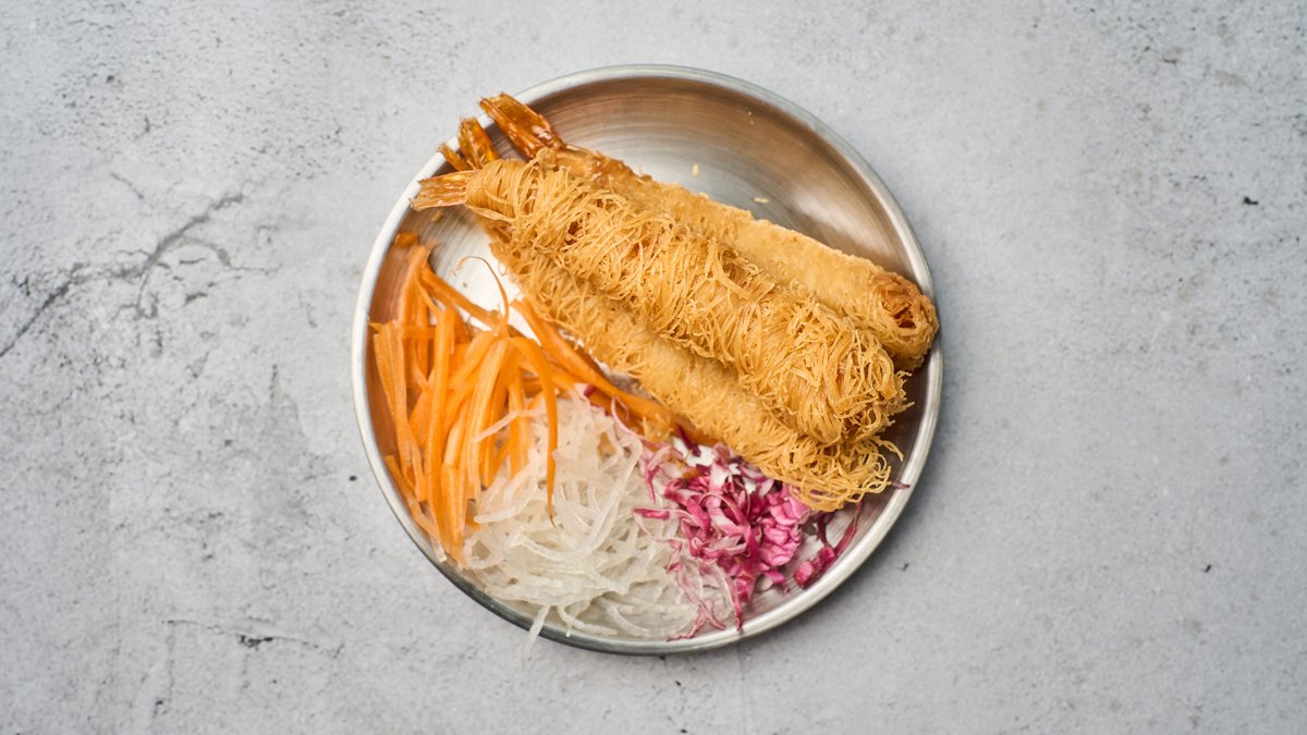 Bao med fyld af friteret reje.