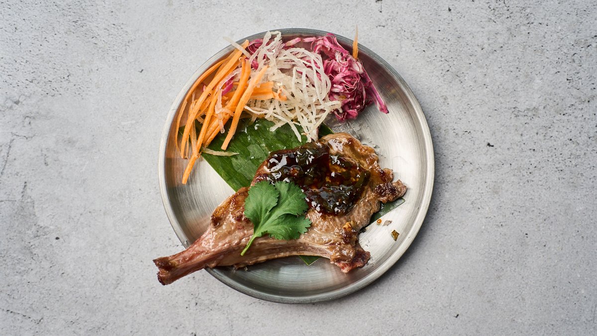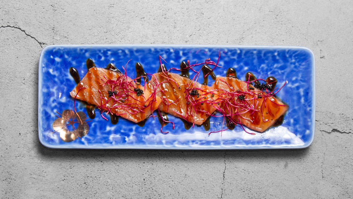 Serveres med yuzu-wasabi soya, teriyaki, spirer rødbede tobiko.
