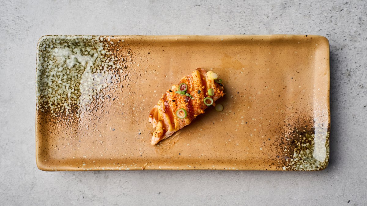 Flamberet laks nigiri