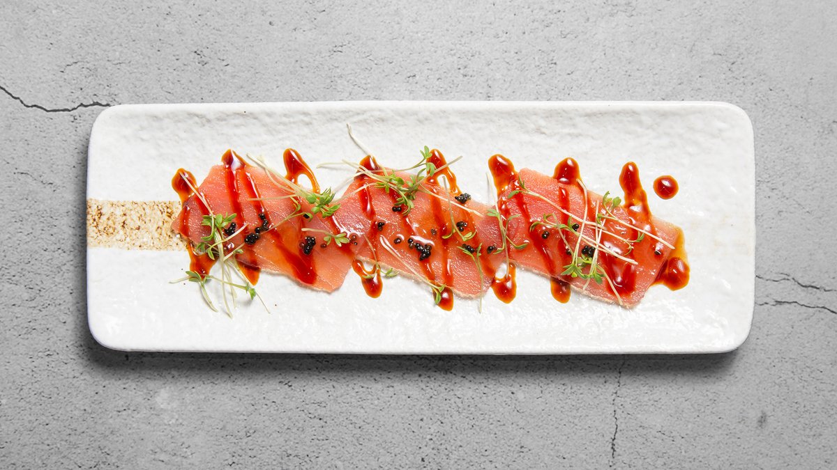 Rå tun i skiver serveres på tang.