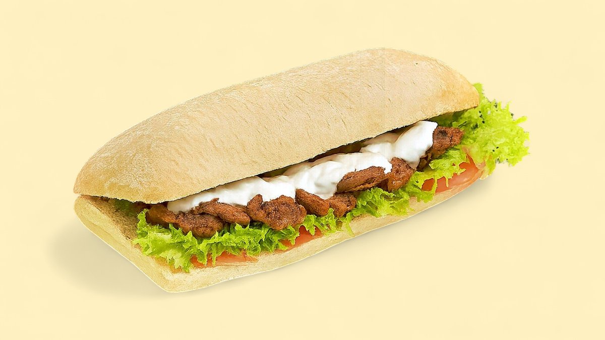 Sandwichbrød smurt med dressing, kebab, tzatziki, salat, tomat og agurk.