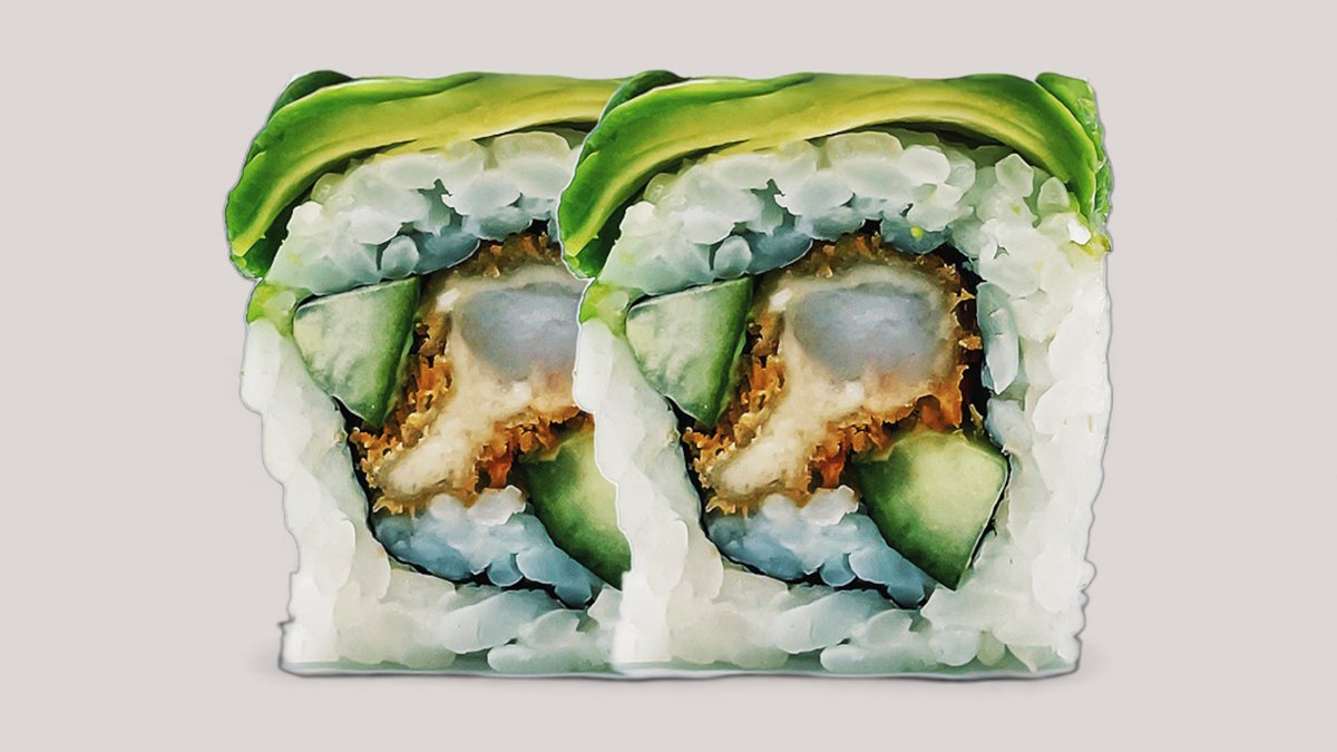 Tempurareje, avocado, agurk og mangomayo, toppet med crispy surimi og grøn masago.