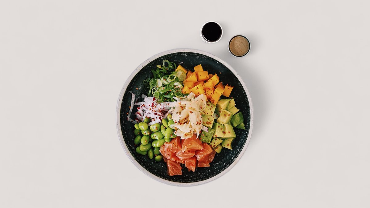 Bowl med fyld af ris, laks, edamame, radise, mango, avocado, ingefær, forårsløg og sort sesam. Serveres med goma dip og unagisauce.