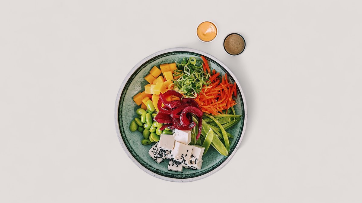 Bowl med fyld af ris, tofu, edamame, mango, sukkerærter, ingefær, syltet rødløg, gulerod, forårsløg og sort sesam. Serveres med gomadip og chilimayo.