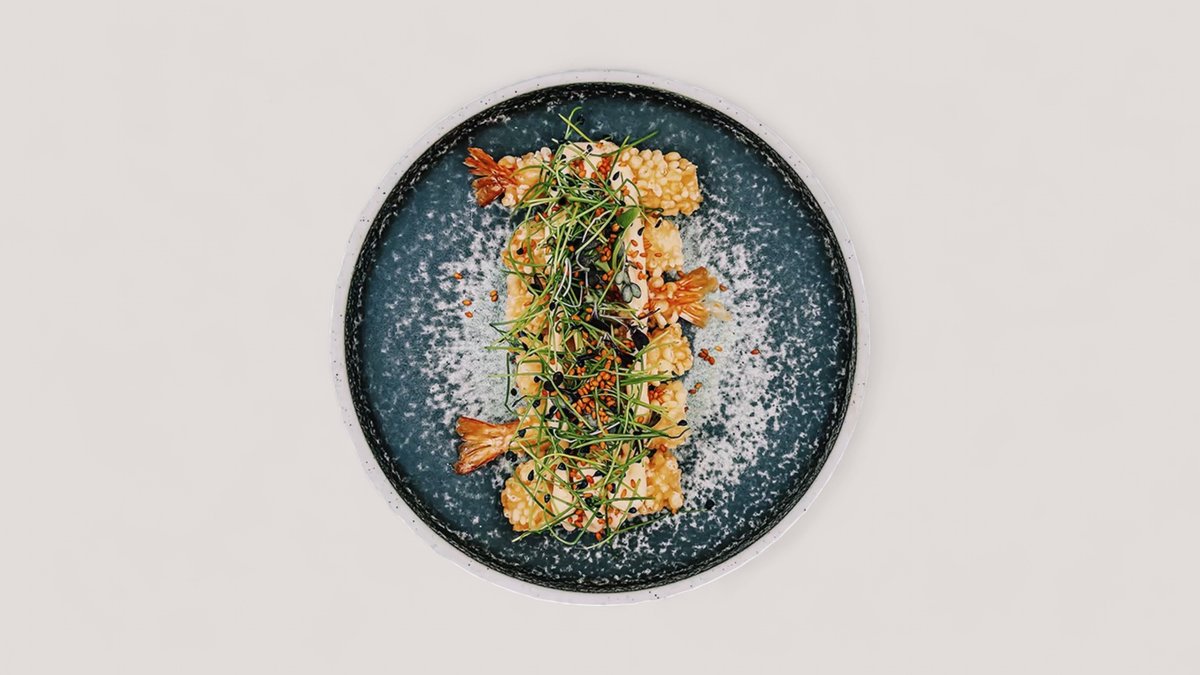Bowl med fyld af ris, tempurarejer, tangsalat, edamame, syltede rødløg, gulerod, forårsløg og sort sesam. Serveres med gomadip og chilimayo.