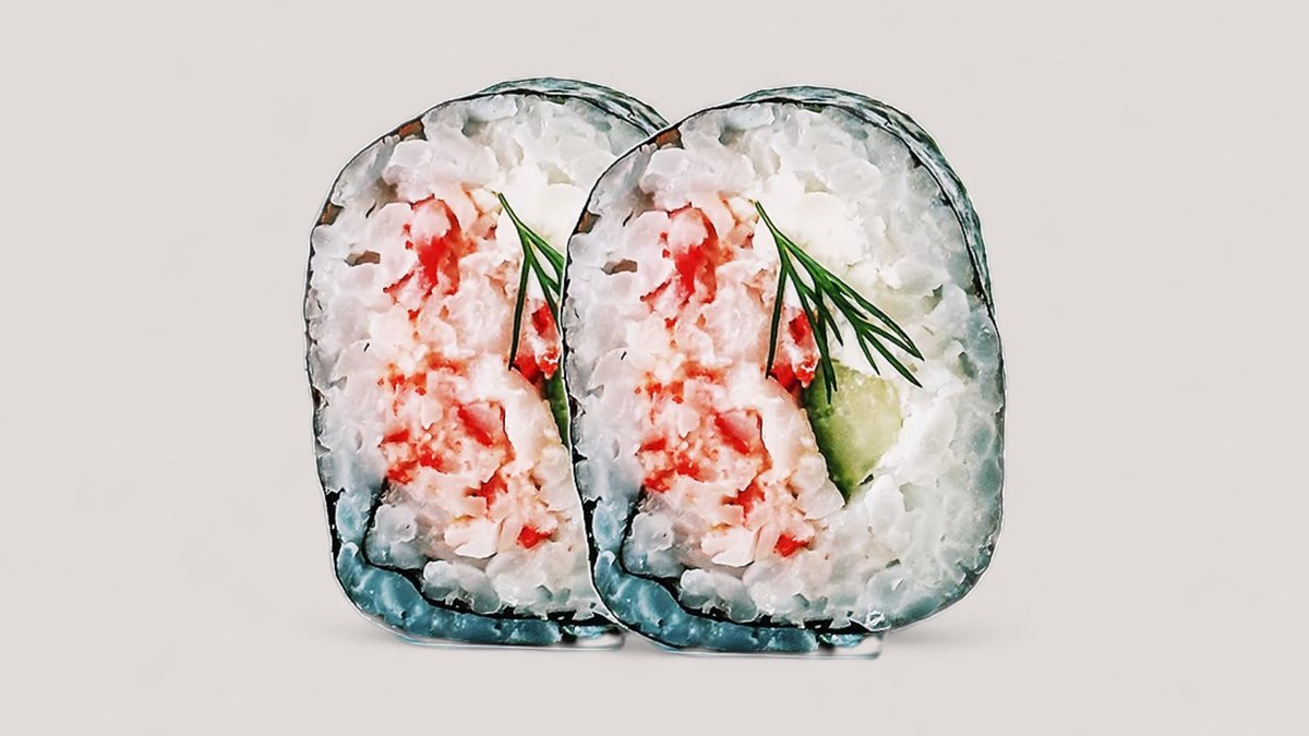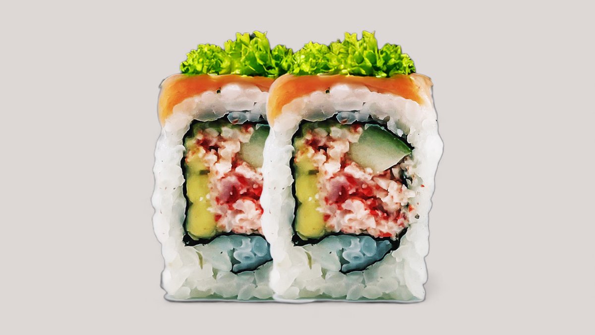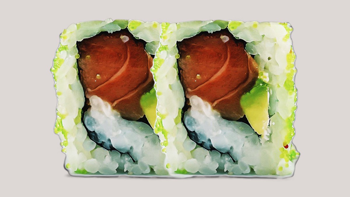 Surimi, avocado og agurk, toppet med lynstegt laks, rød masago, forårsløg, unagisauce og mayo.