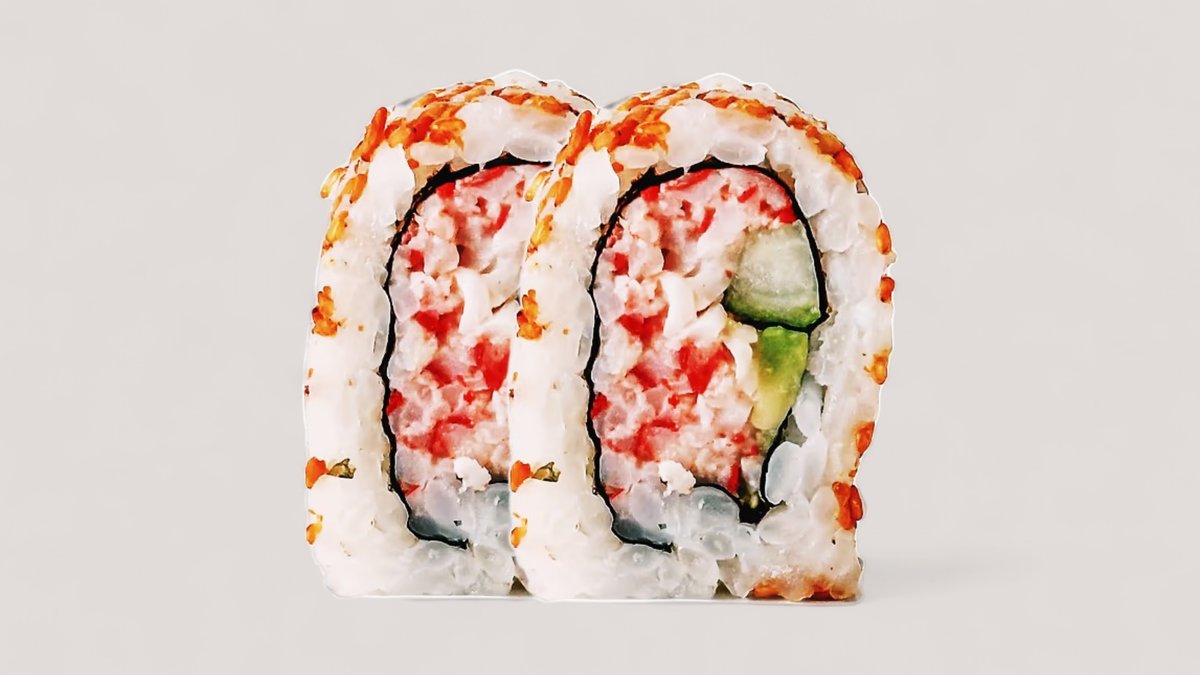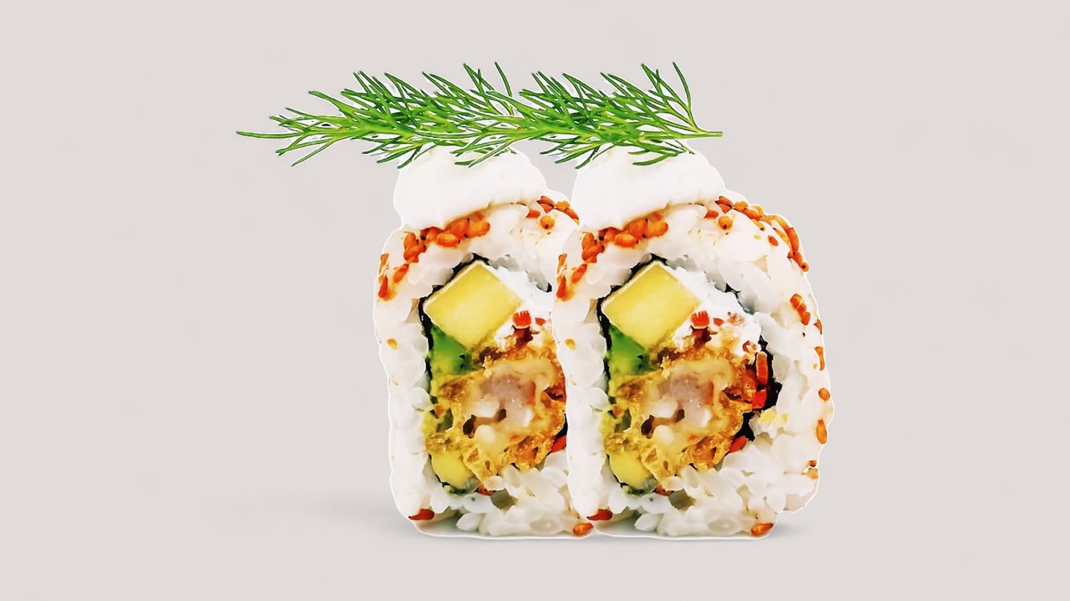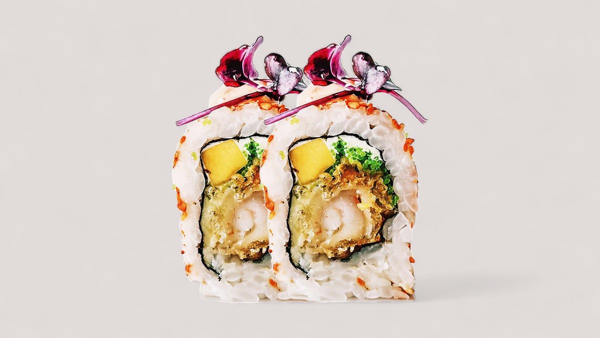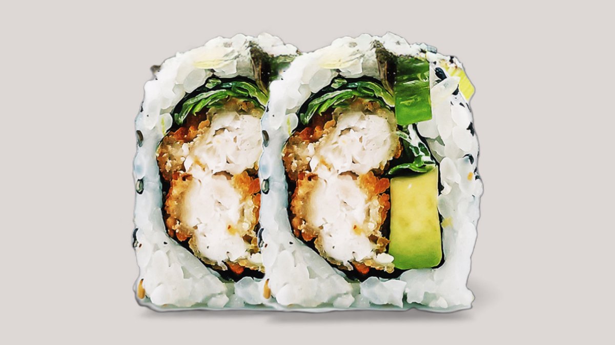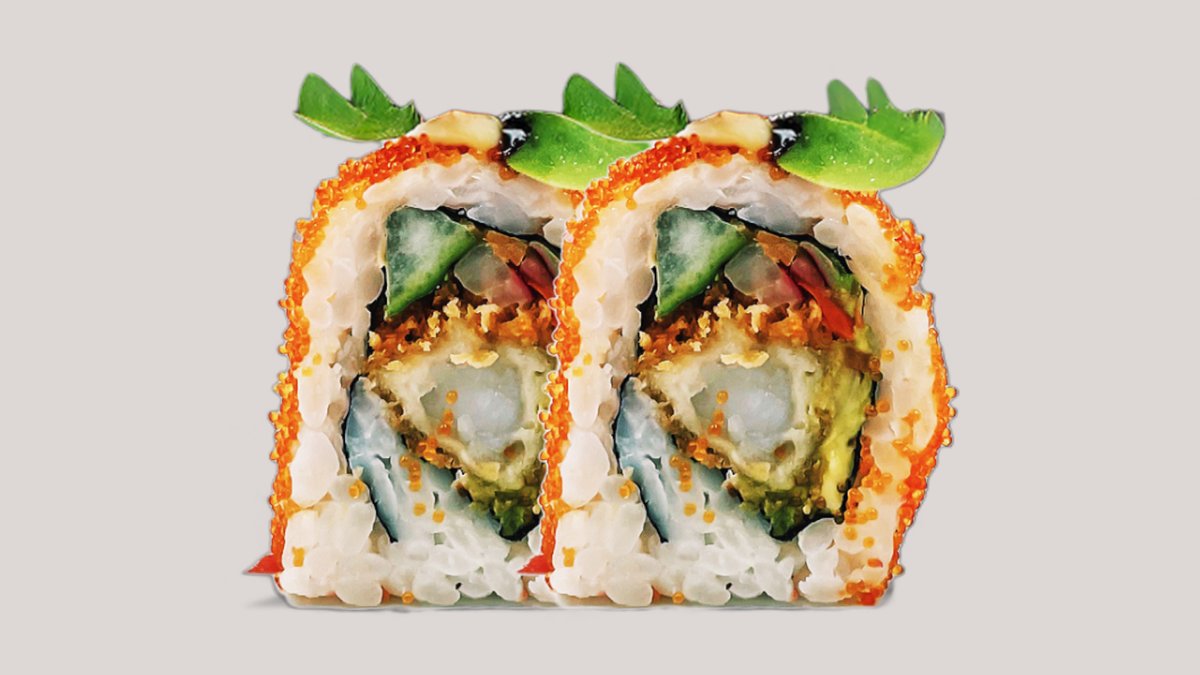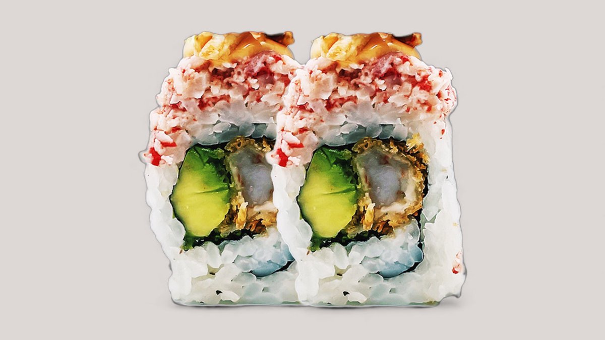 Tempurareje, avocado, agurk og mangomayo, toppet med surimi og grøn masago.