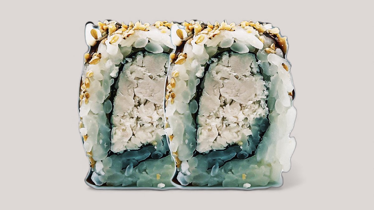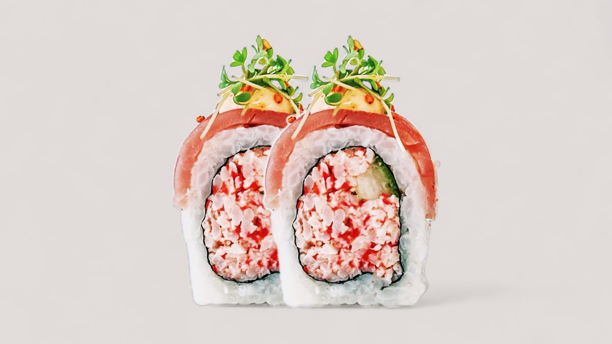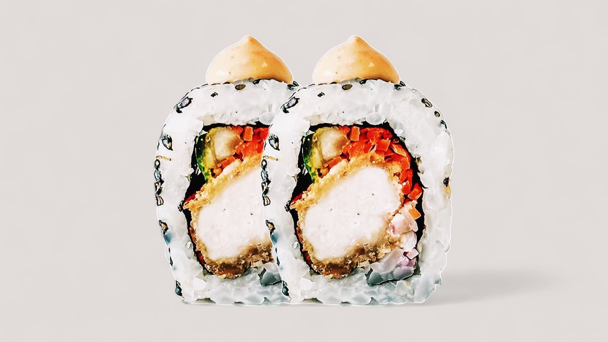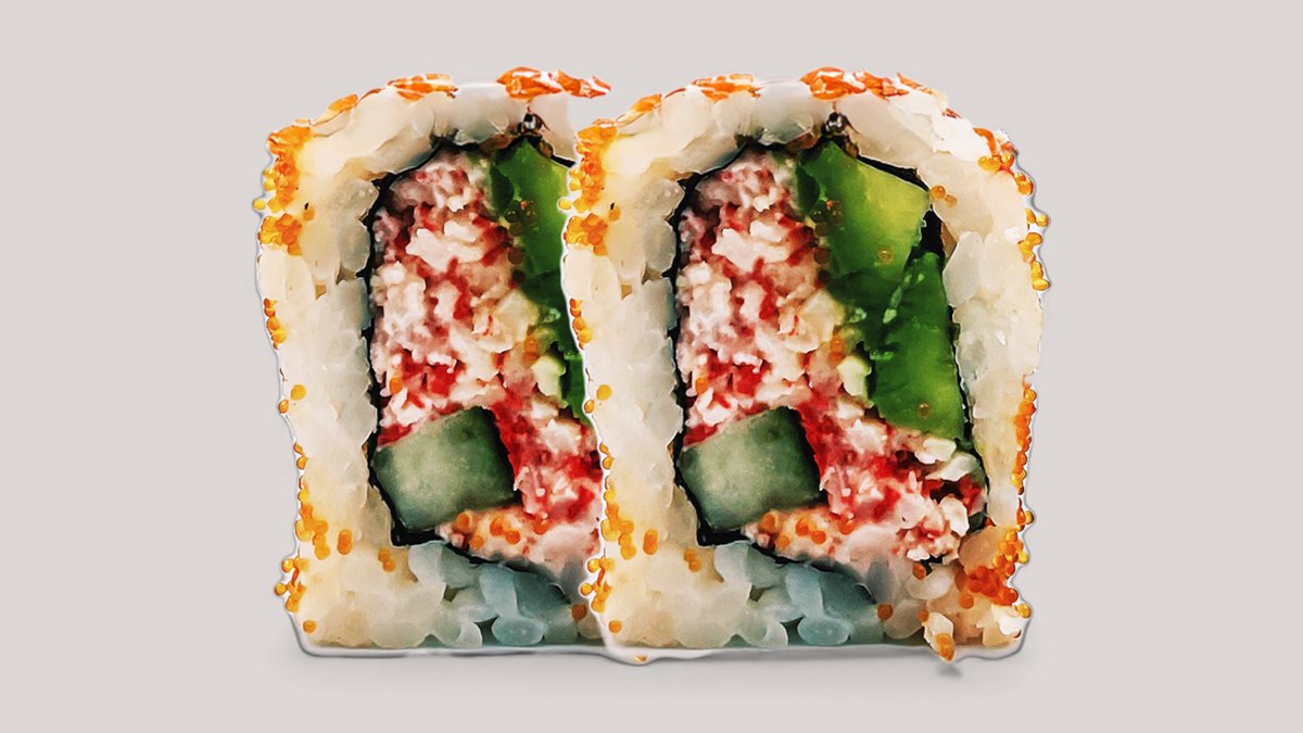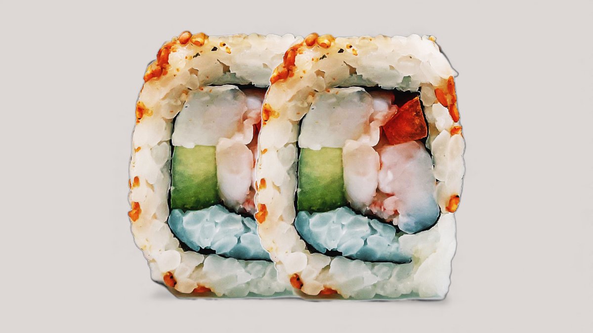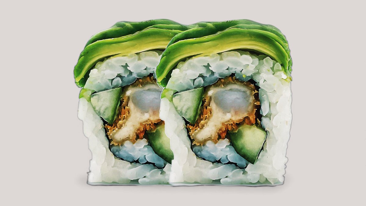 Tempurareje, avocado, agurk og mangomayo, toppet med surimi og grøn masago.