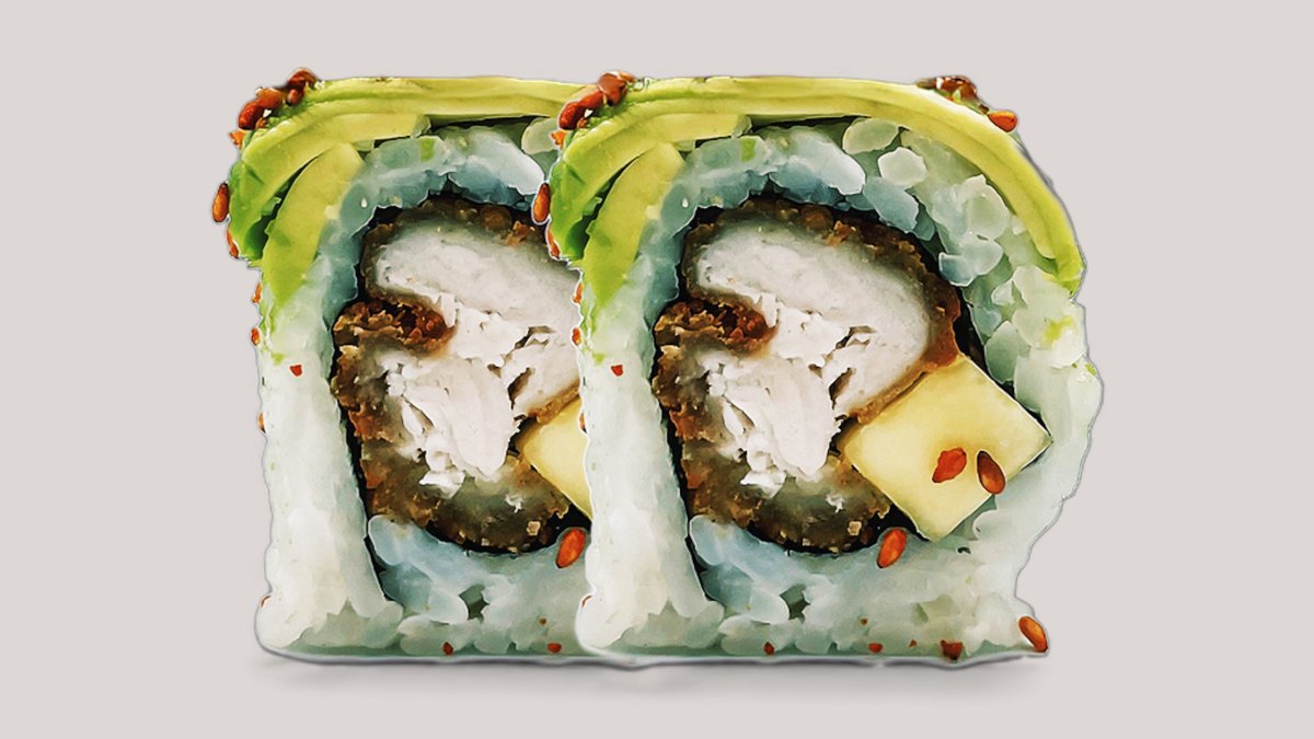 Velfærdskylling, cream cheese, avocado, forårsløg, unagi og chilimayo, rullet i hvid og sort sesam.