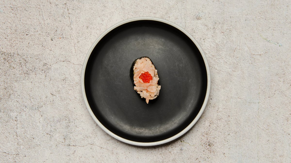 Noritang rullet rundt om en lille risbolle og toppet med rå fisk.