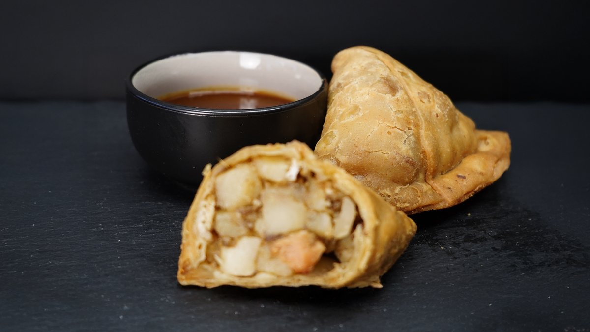 Friturestegt samosa med fyld af kartofler, blomkål, ærter og krydderier.