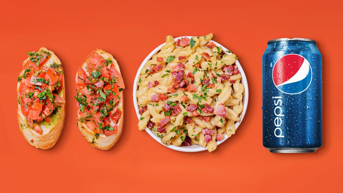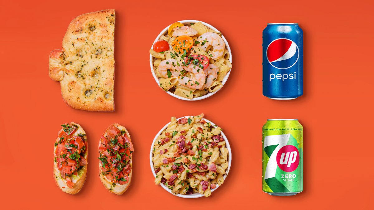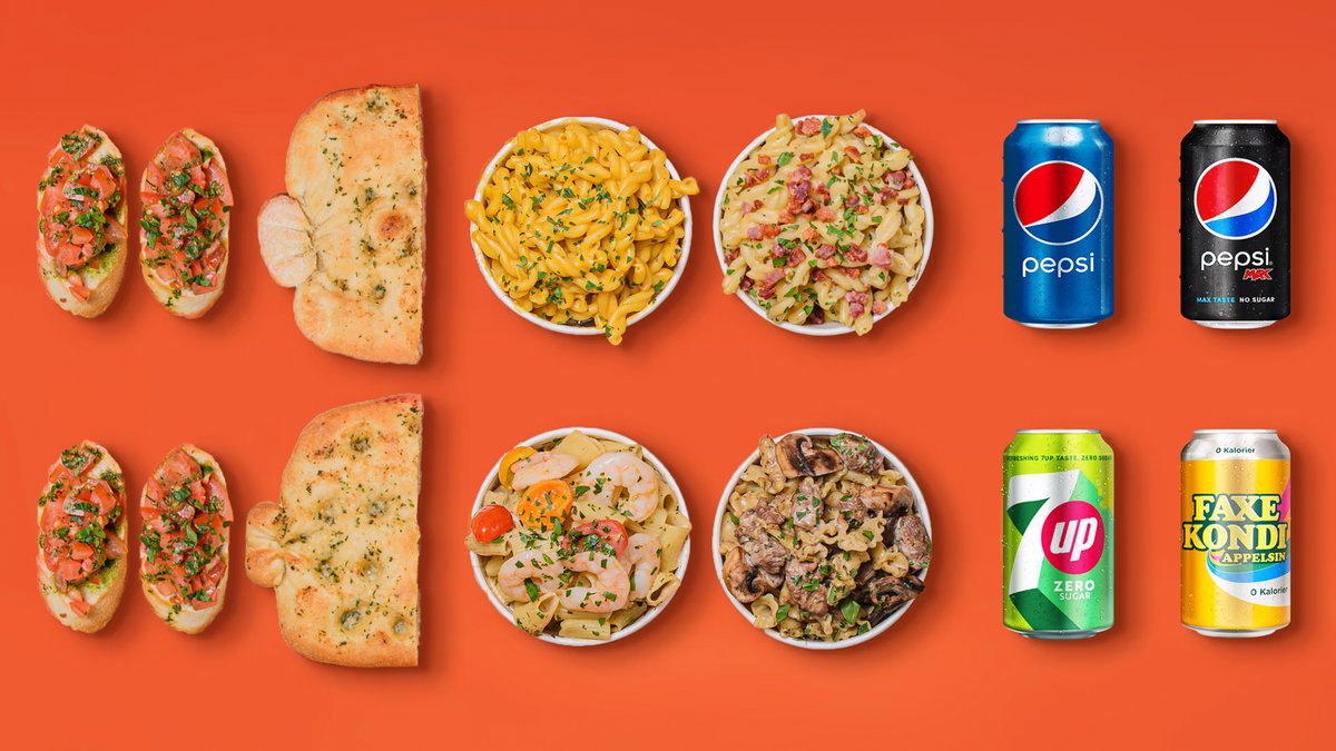 Tilbud på combo-menuer. Pastaret, brød og sodavand.