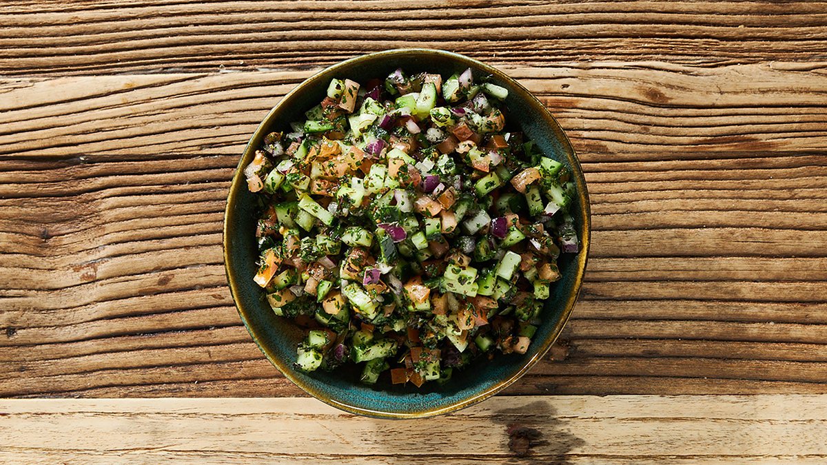 Finthakkede tomater, løg, agurker og persille vendt med citron og olivenolie.
