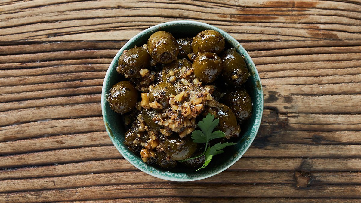 Oliven, granatæblesovs, malede valnødder, hvidløg, tørret basilikum, tørret koriander, salt