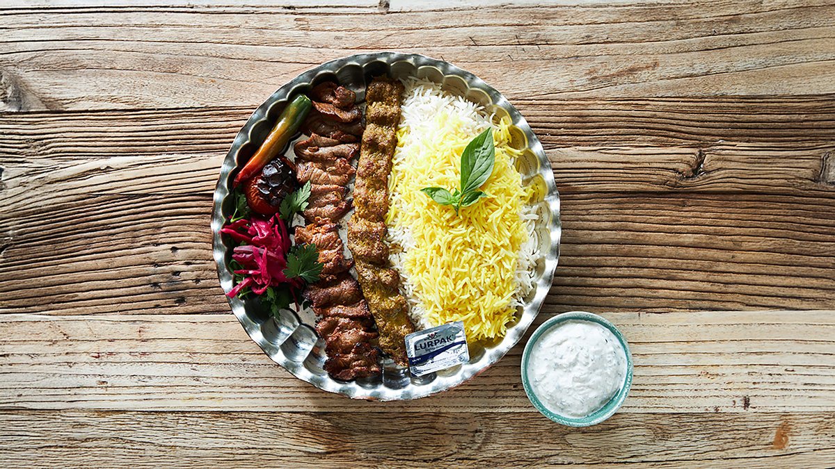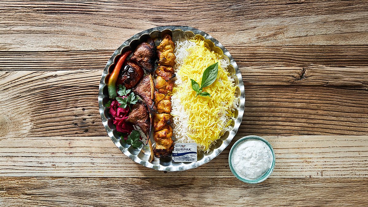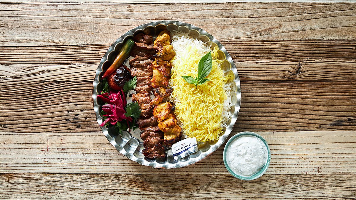 1 spyd Barg og 1 spyd Kubideh, serveret med ris toppet med safran, grillede tomater og grillede peberfrugter samt Mast Khiar.