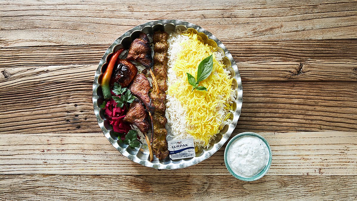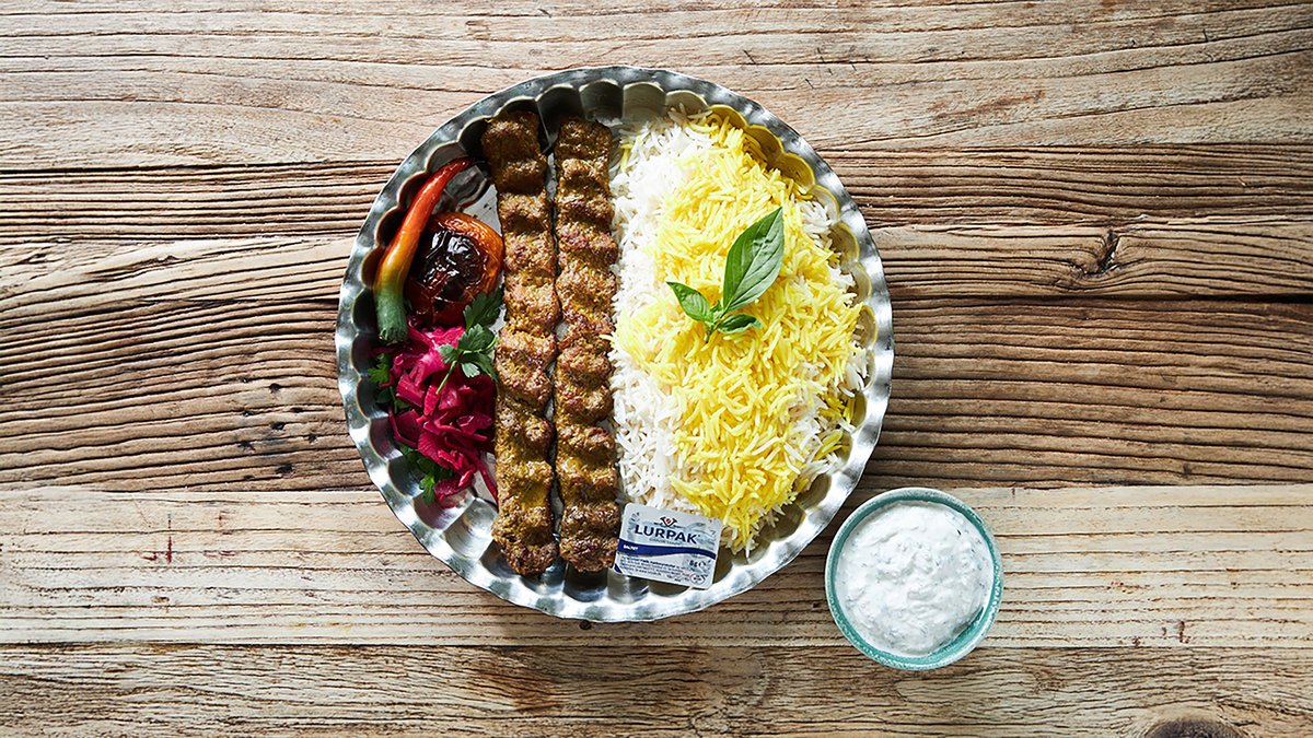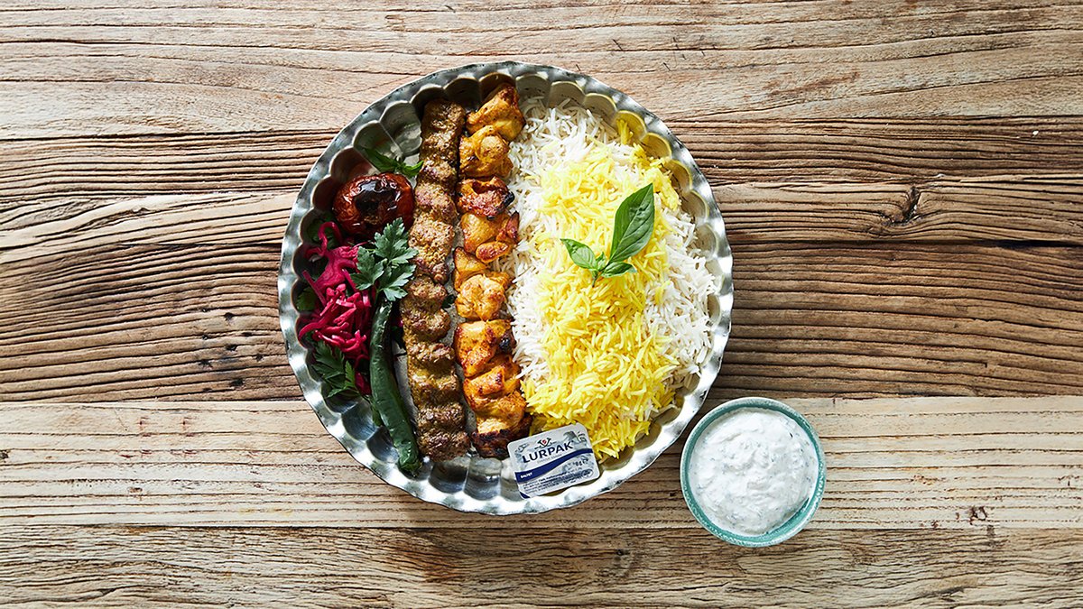 2 x spyd Kubideh, serveret med ris toppet med safran, grillede tomater og grillede peberfrugter samt Mast Khiar.