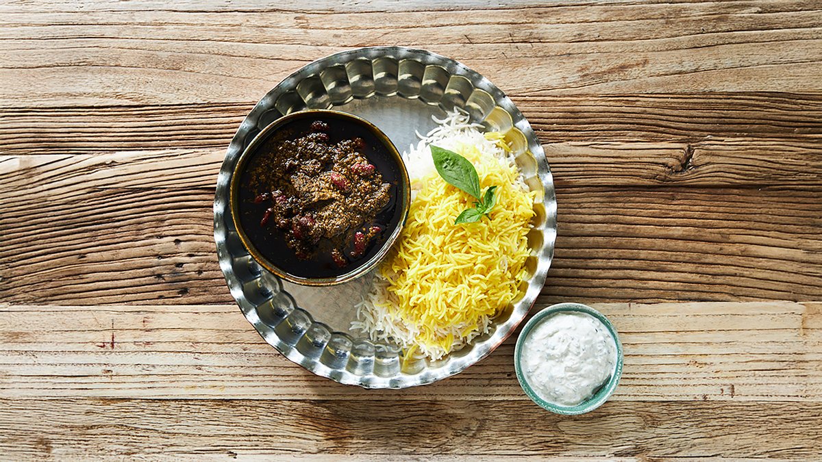 Miniportion af Ghorme Sabzi, serveret med ris toppet med safran og Mast Khiar.