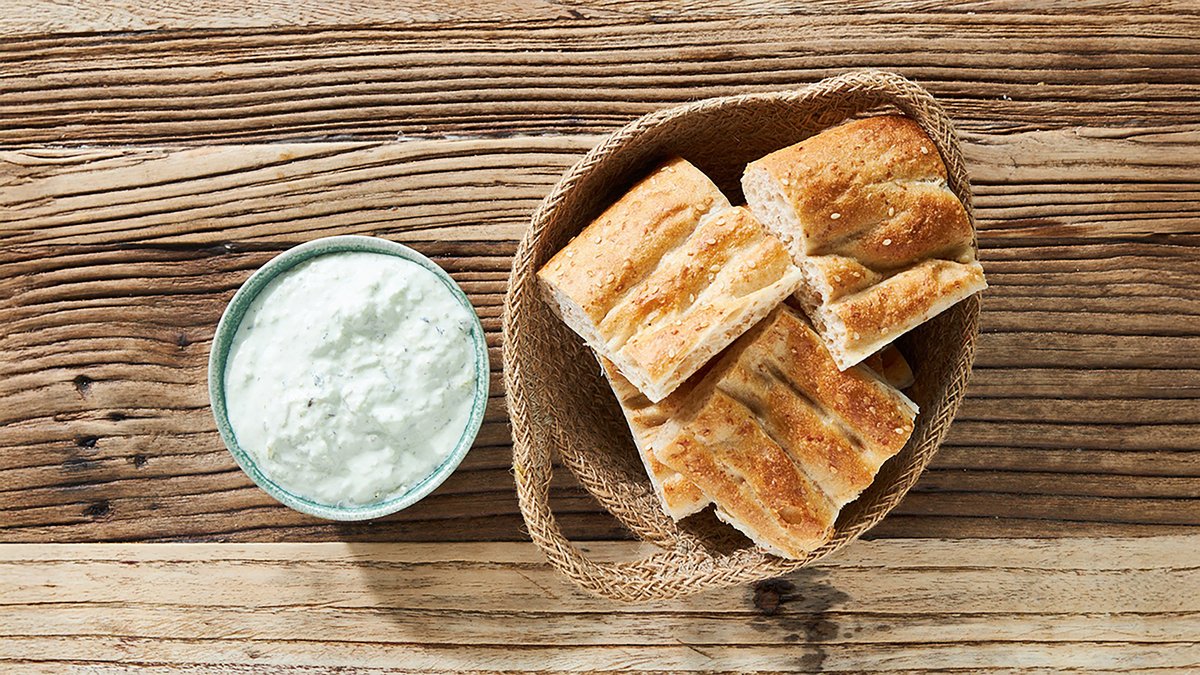 Grillet aubergine med hvidløg, valnødder, mynte og yoghurt. Serveres kølet net og med brød.