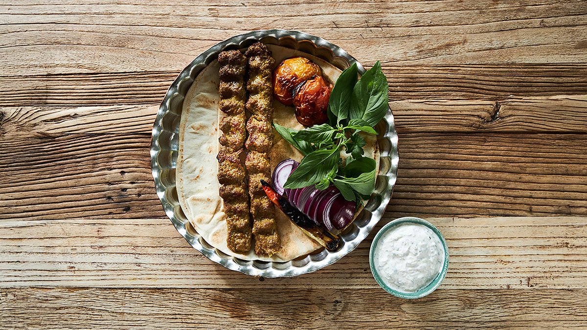 2 spyd Kubideh serveret med 2 brød, grillede tomater, grillede peberfrugter, frisk basilikum, frisk persille og løg samt Mast Khiar.