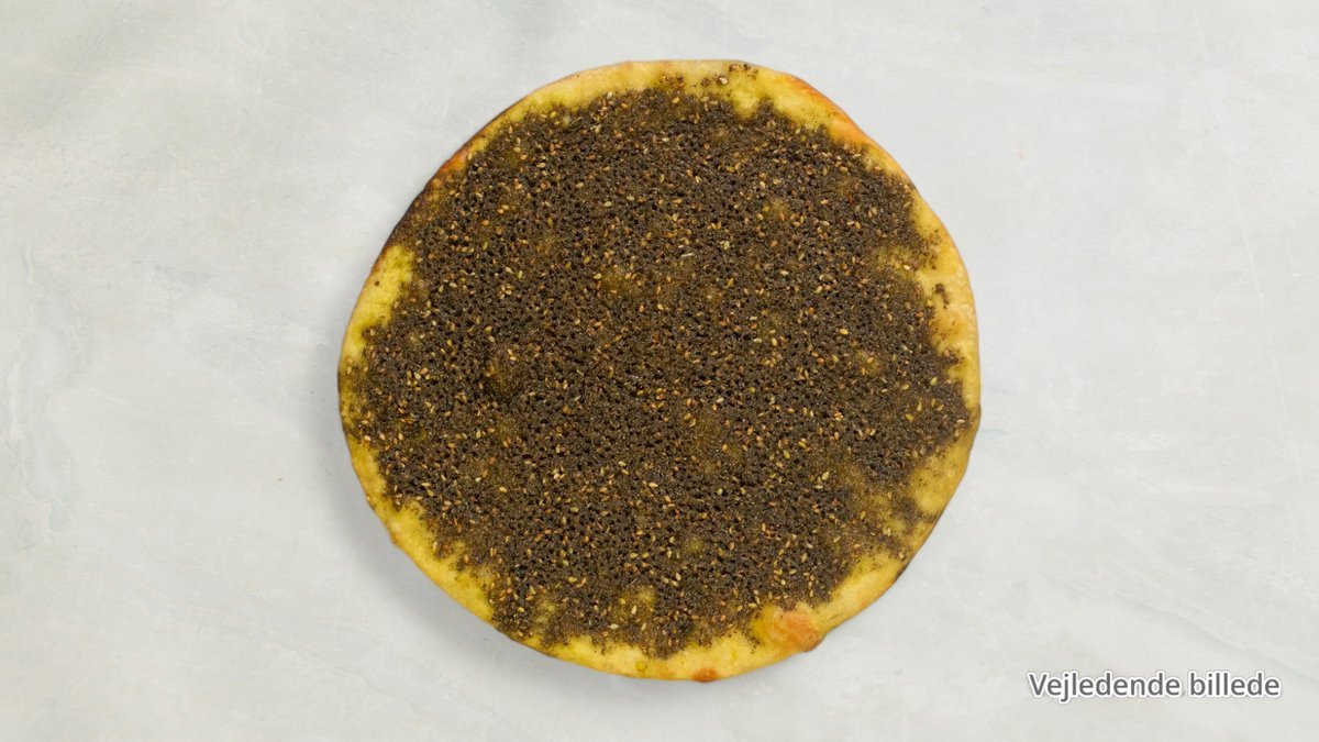 Fladbrød, falafel, salat, tomat, løg og dressing.