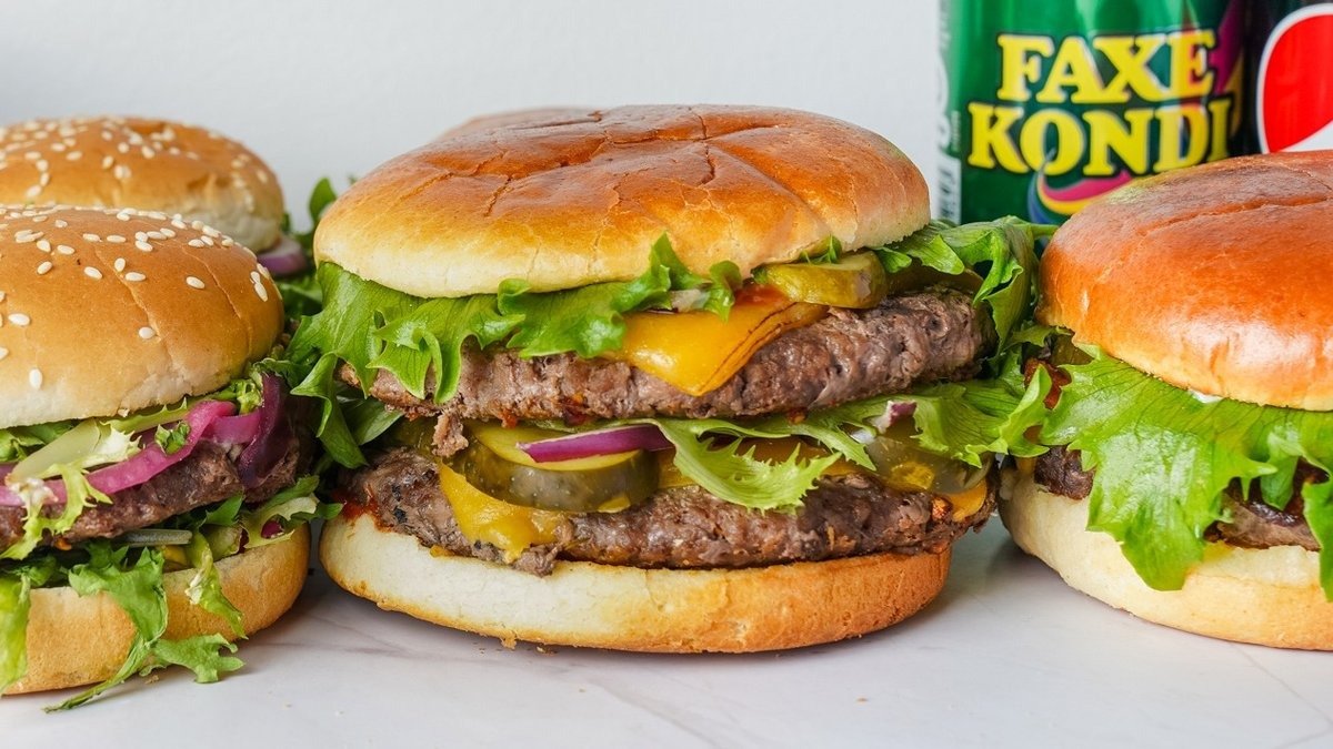 Plantebaseret Bøf, hjemmelavede sprøde syltede agurker, salat, tomat, løg, vegansk ketchup, vegansk mayo. Økologisk & glutenfri burgerbolle Lavet med 100% økologiske grøntsager. Serveres med sprøde pomfritter, en sodavand og én dip