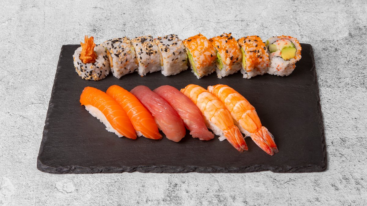Maki: 4x Crispy Ebi 4x California Roll 4x Spicy Tuna 4x Philadelphia Roll Nigiri: 2x Laks Nigiri 2x Tun Nigiri 2x Reje Nigiri