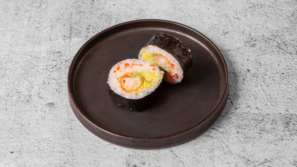 Serveres med tigerrejer, avocado, agurk, masago og sesam.