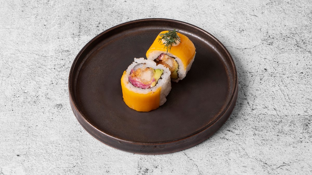 Serveres med tempurareje, avocado, sesam, masago og teriyaki.