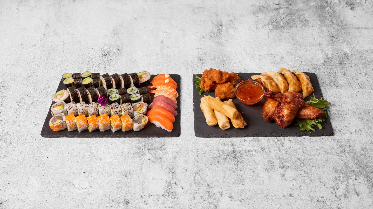 Starters: Laks Carpaccio og Tempura Ebi. Nigiri: 2 x Flamberet laks 2 x Flamberet tun 2 x Avocado Gunkan: 2 x Laks tartar Kaburimaki: 8 x Red Dragon 8 x Sunmaki Futomaki: 2 x Tasty Futomaki